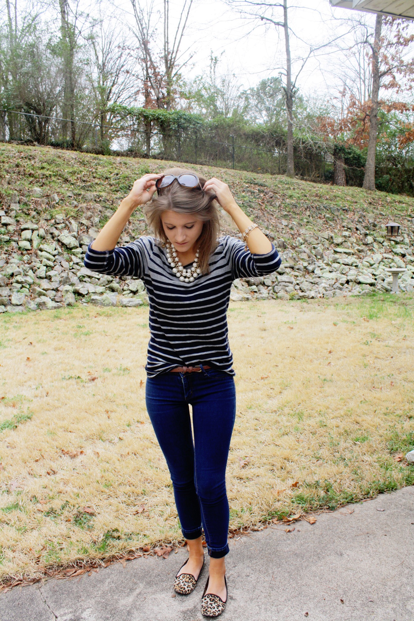 Stripes, leopard, and pearls. Oh my! The new classic is an expert combination of preppy elements to create a clean yet trendy outfit. The weather is finally cooperating with my wish to sport some of my favorite spring looks so I dragged out a striped J.Crew shirt and my leopard flats. It should be noted that this is the first time I’ve worn flats to work. Ever. What can I say? I’m a heel girl. The look was complete with statement pearls, a thin brown belt, a navy blazer (not pictured) and dark tortoise sunnies.