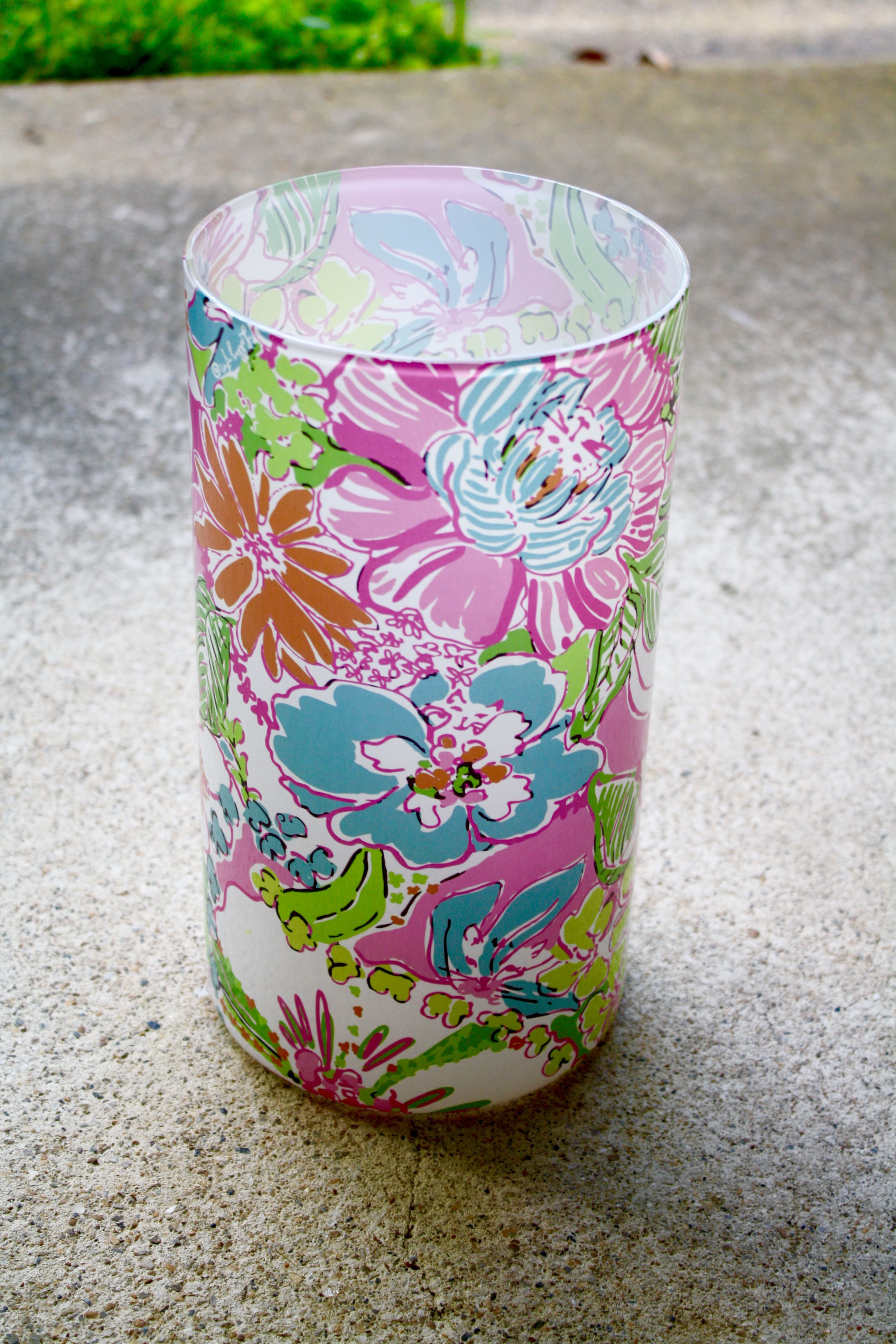 Glass 10″ candle holder in Nosie Posey ($20)