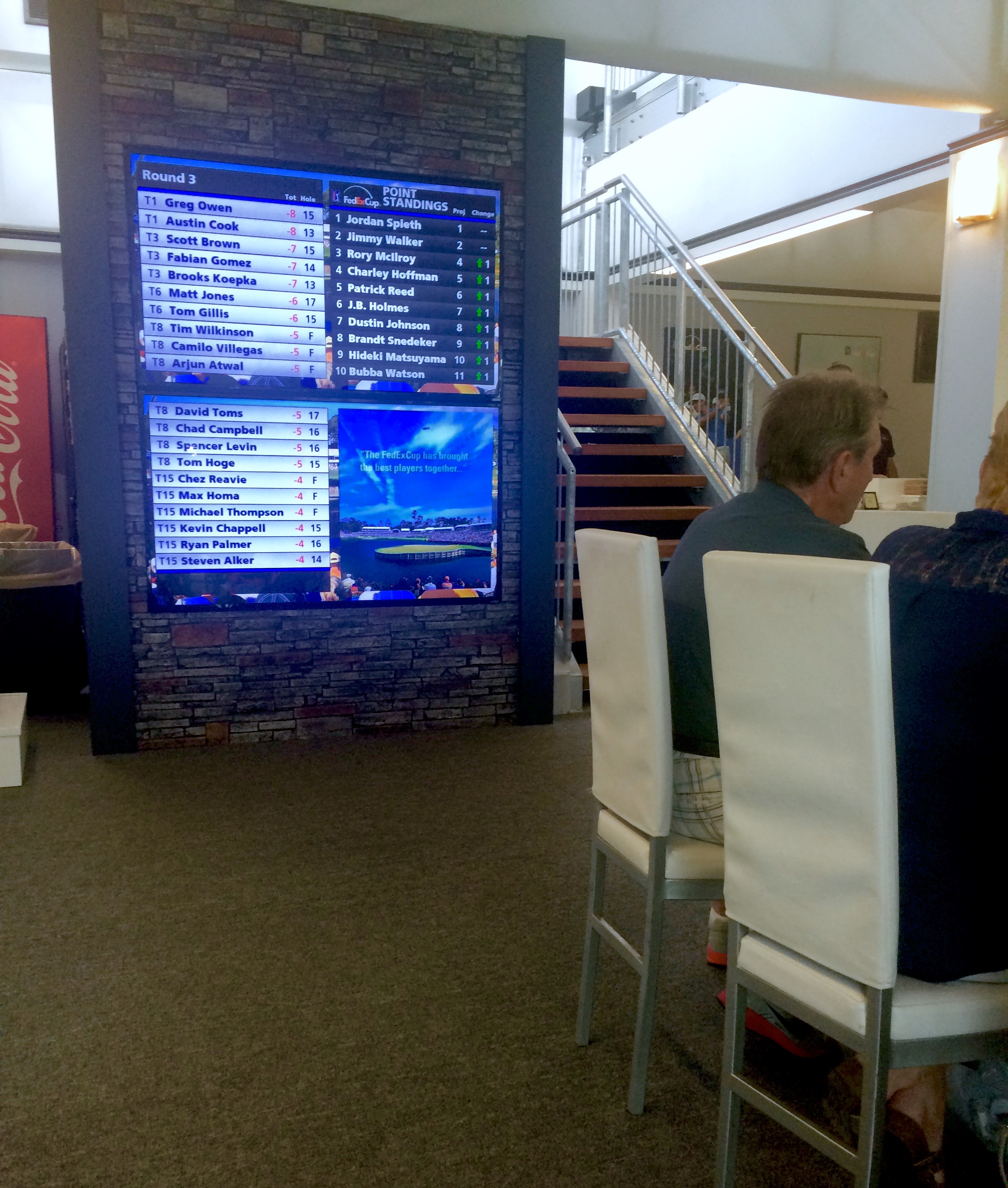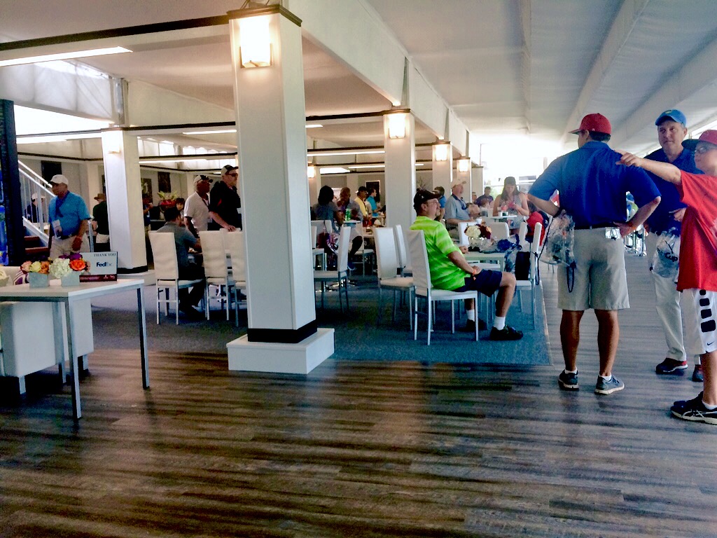 The corporate cabana was gorgeous, y’all! The first floor held the food stations…we’re talking BBQ, chicken, salad, dessert, fully stocked bar, etc. Incredible. The upstairs had a lounge and an outdoor grandstand where we could watch the players come up the 18th fairway. That’s where we spent most of our time and it was heavenly!