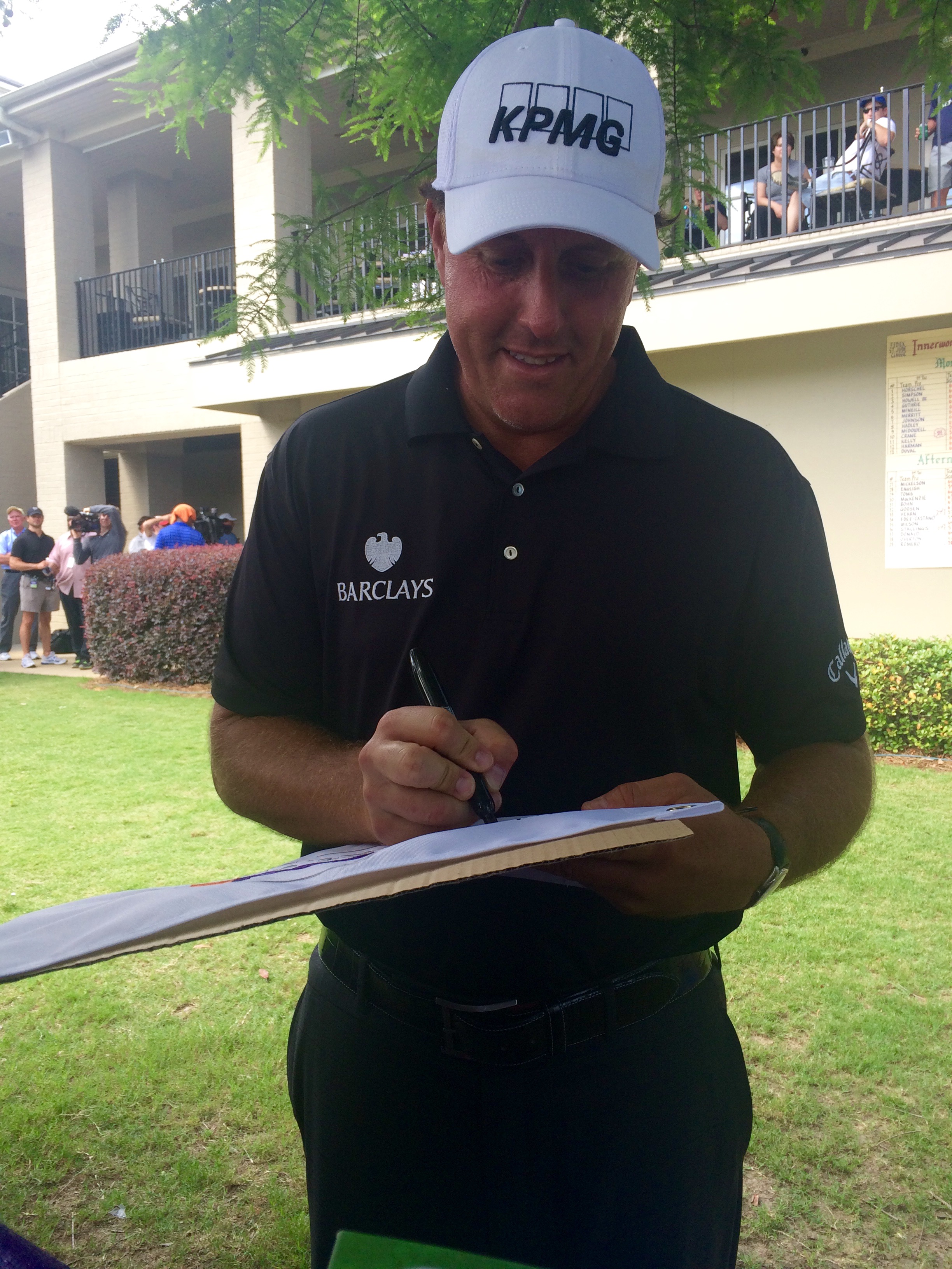 I was able to see my favorite players at the tournament at least once: Ben Crane, Camilo Villegas, Boo Weekley, Ken Duke, and of course, Phil Mickelson. Photography on the course is absolutely prohibited (so don’t ask how I got the picture of Ben Crane above…shhhh!) but some of the players stepped outside of the clubhouse for autographs and TV interviews after signing their scorecards. Phil stood right in front of us for his interview with CBS then signed autographs for the massive line of people. Dad and I were lucky enough to be at the front!
