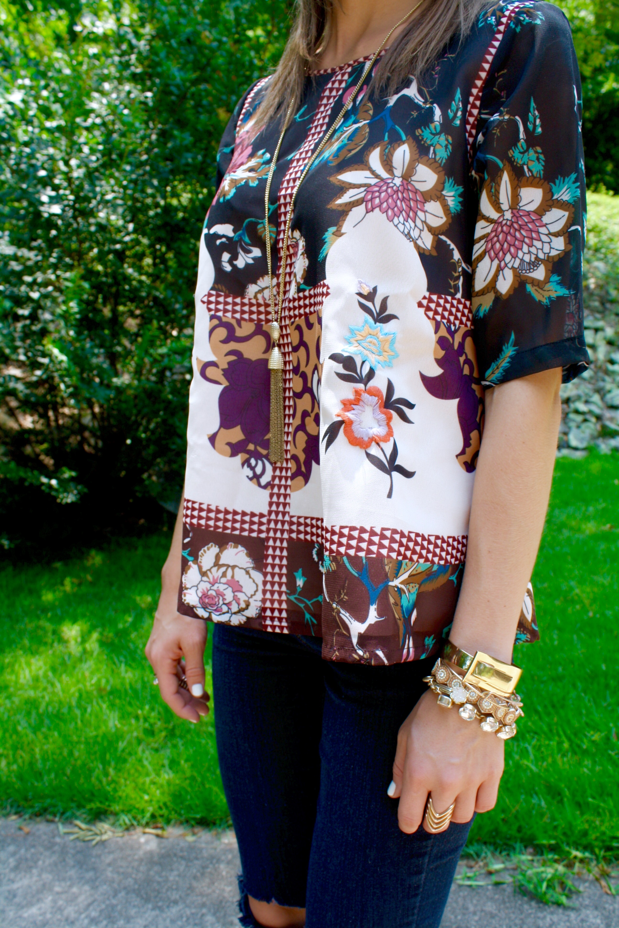 One store that I’ve heard nothing but rave reviews about, but never once been in, is Anthropologie.  Well I broke my Anthro virginity over this past weekend and shopped their sale.  I’m in love with this store now, y’all.  It could turn out to be one expensive addiction, but I think it will totally be worth it.  I discovered this beautiful Vineet Bahl top on the sales rack and instantly knew I had to have it.  The muted colors are perfect for all seasons and the pattern just makes it all the more beautiful.  Gold accessories and nude heels made this top a major statement on a Monday morning at work.
