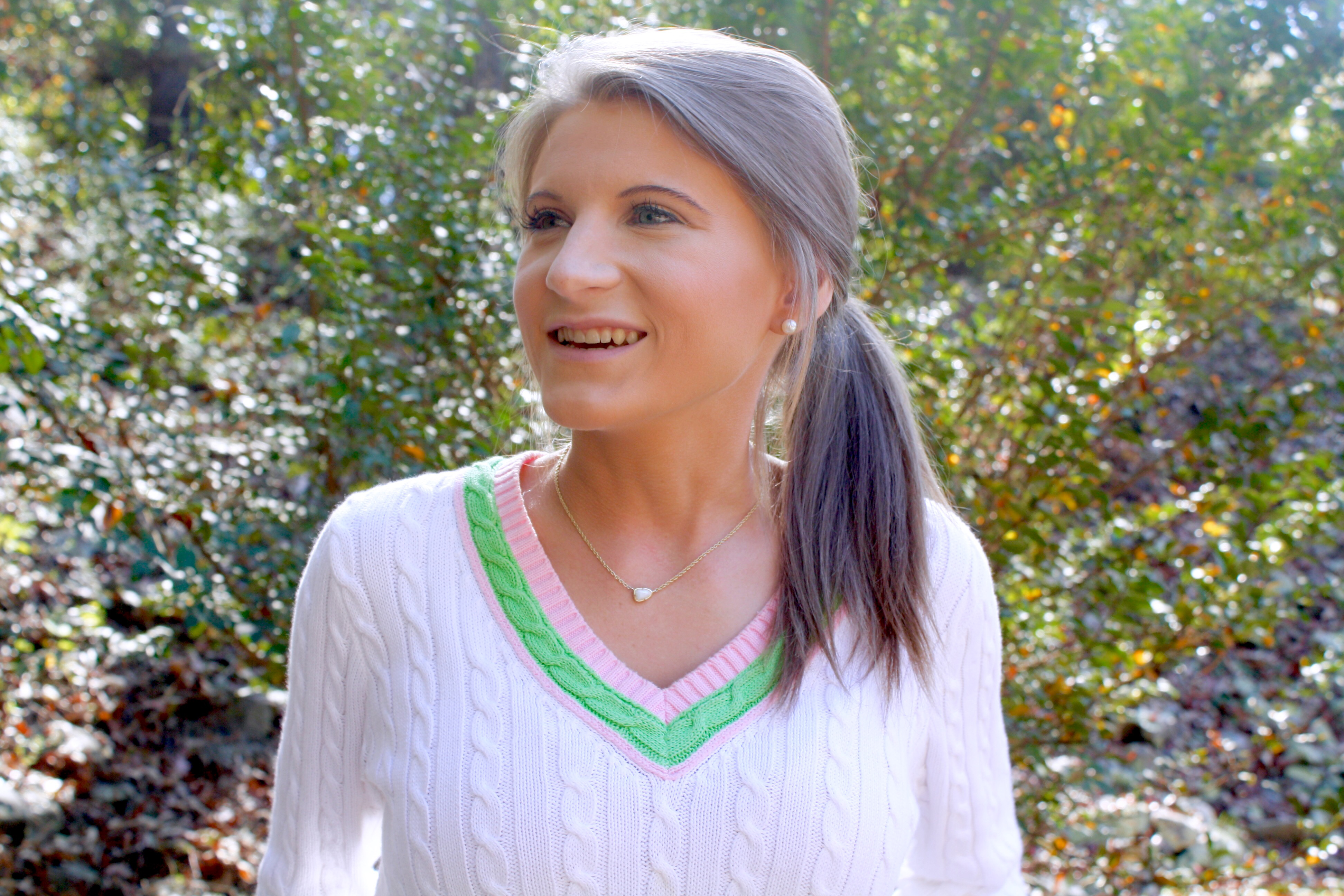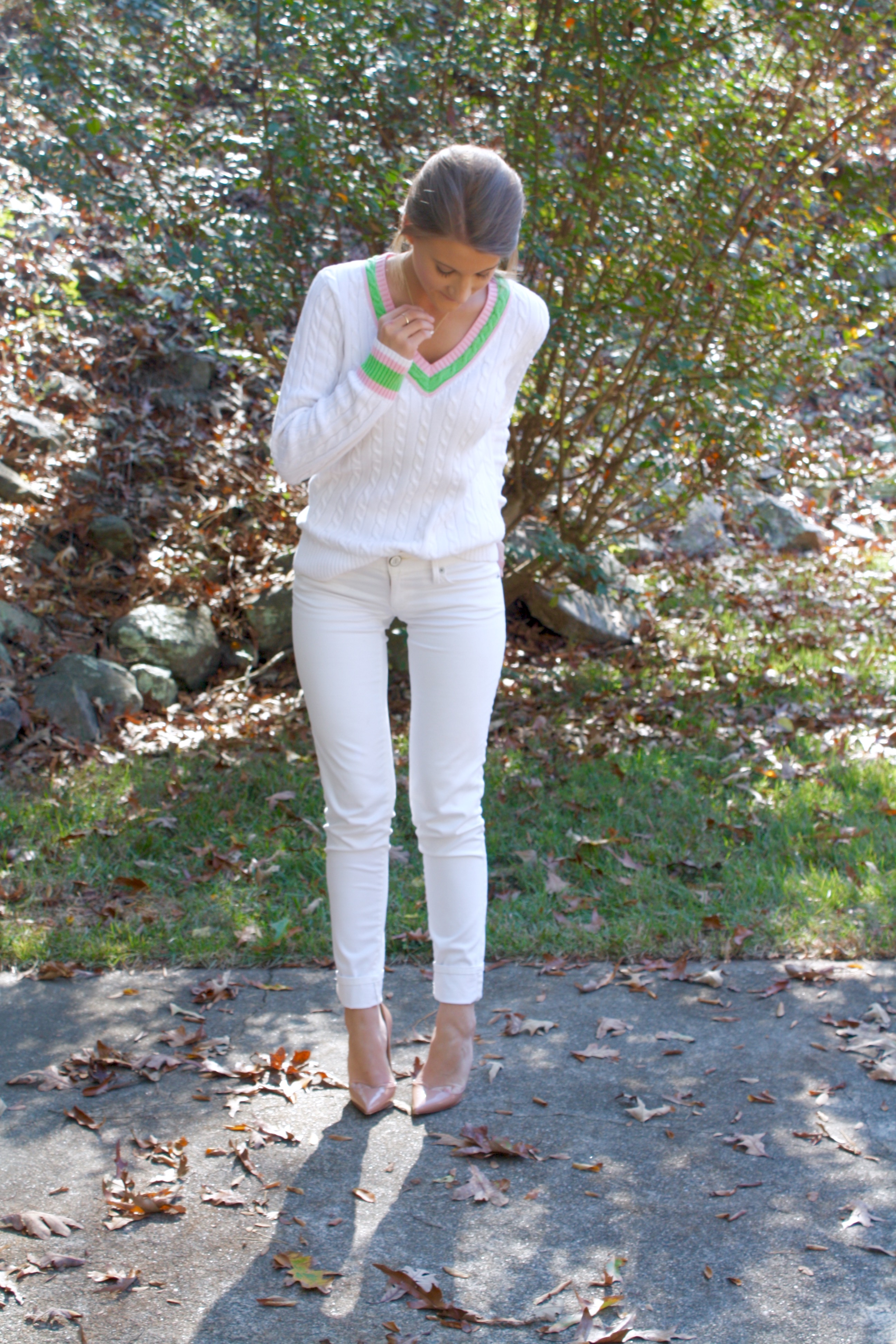 There is nothing more preppy or classic than a crisp, white tennis sweater. Double points if it’s from Lilly, like this one. I have Poshmark to thank for this cable-knit beauty. The green and pink piping across the neckline and sleeves give the sweater the perfect amount of color. Pairing the sweater with an equally crisp white jean gives the outfit the statement it needs. Adding in subtle shoes and delicate accessories kept the outfit light and classic.