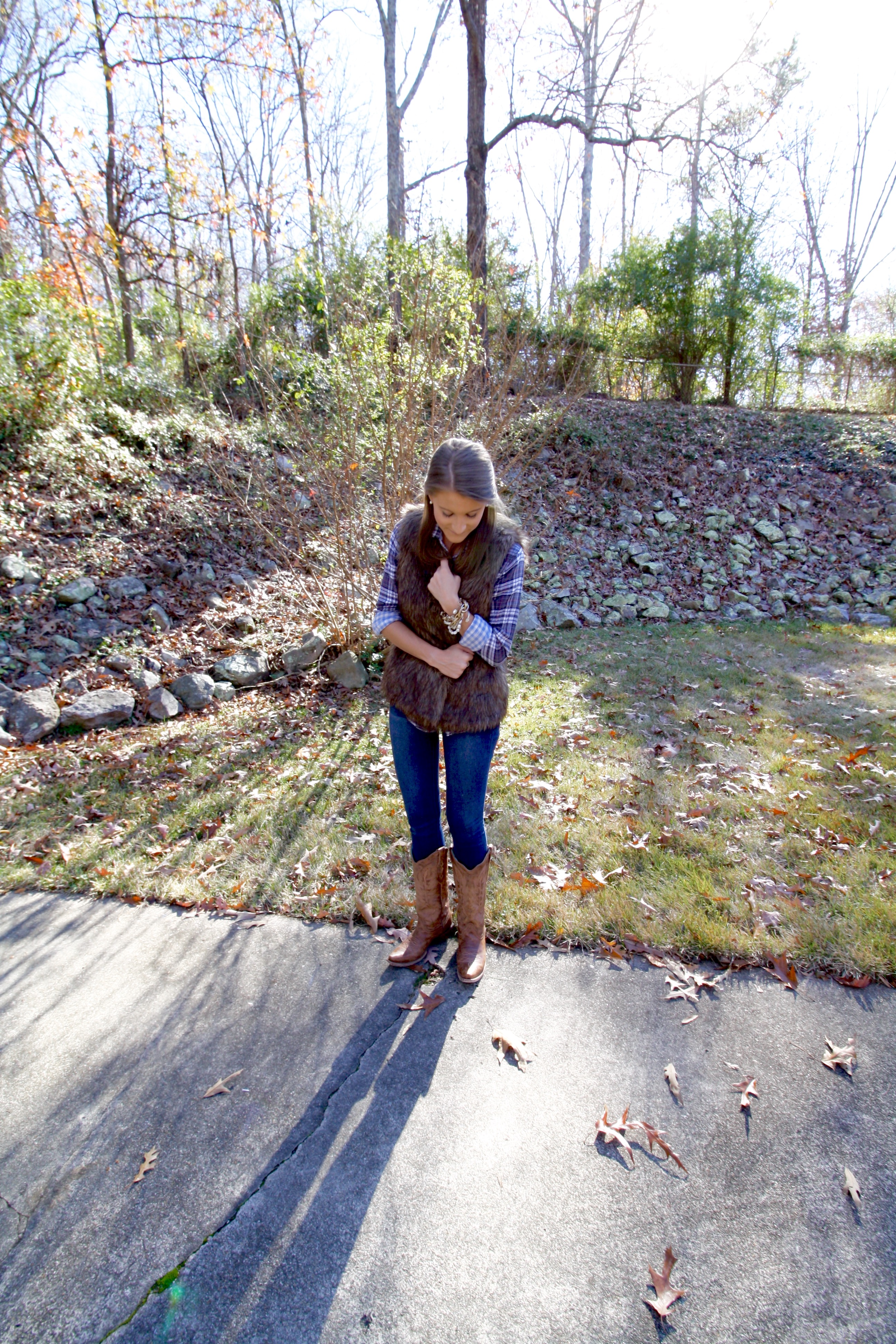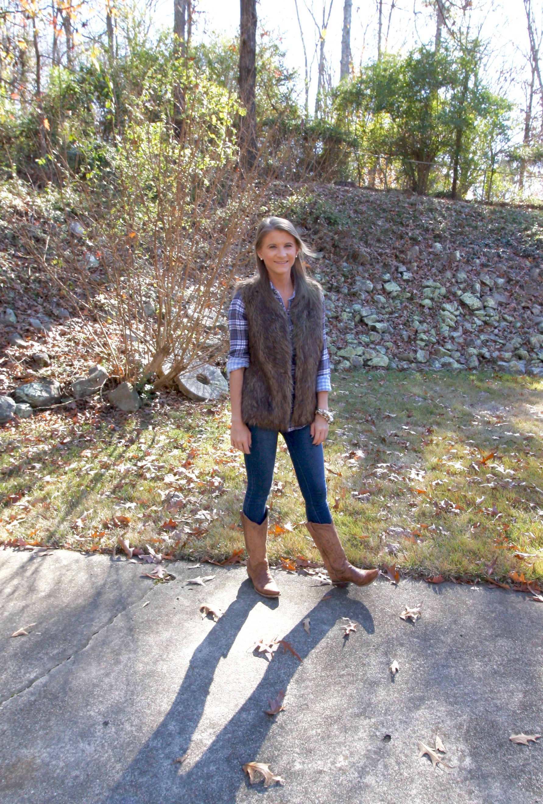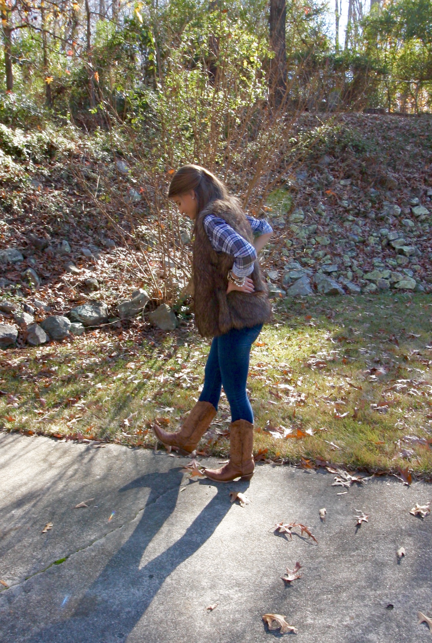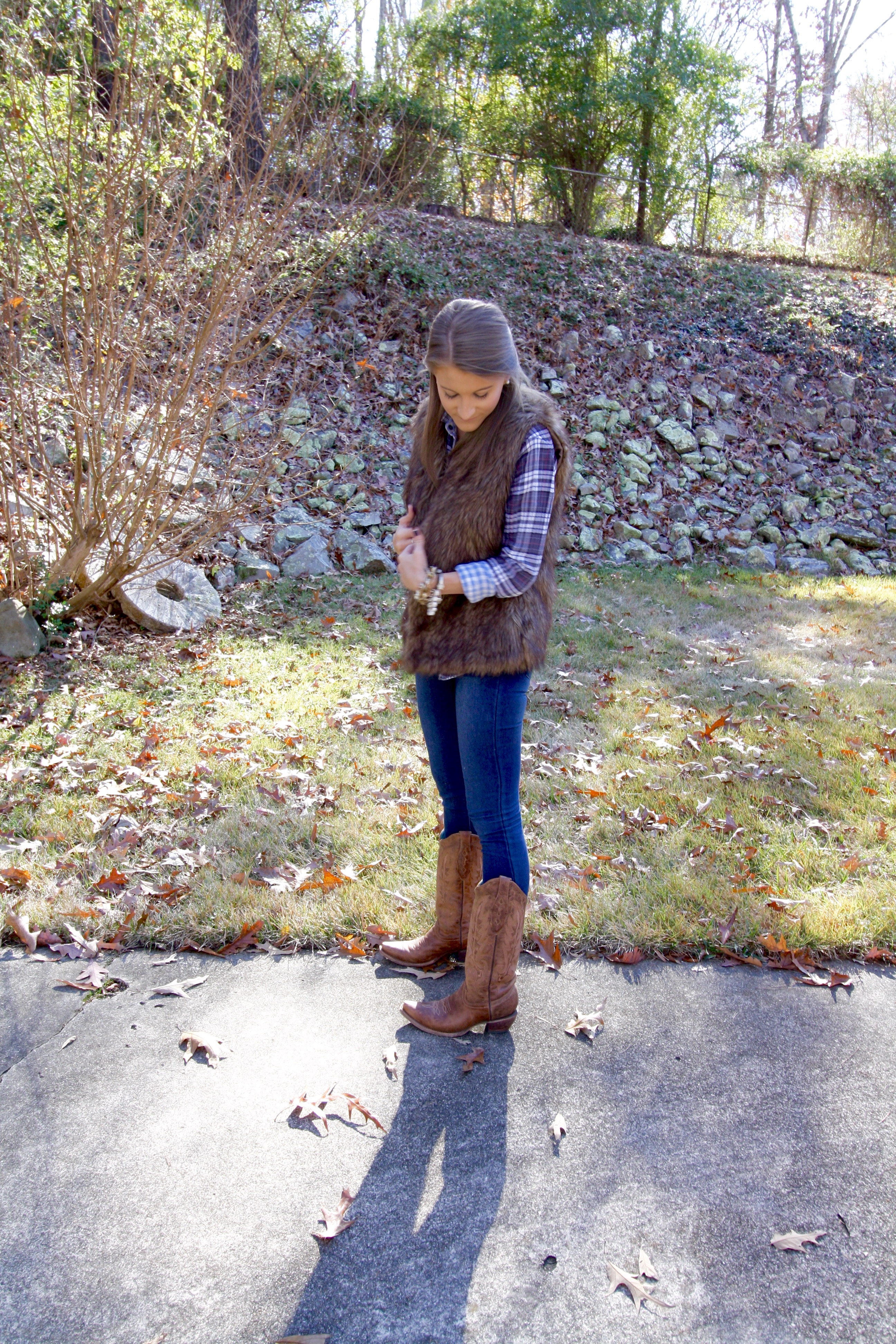 Nothing says Fall like plaid! Plaid just seems to radiate comfort, coziness, and cool weather. Add a faux fur vest to a plaid shirt (or anything plaid, really) and you’re ready for an on-the-go Fall day. I spiced this outfit up with my favorite pair of cowboy boots but kept the whole look neutral and cool-toned.