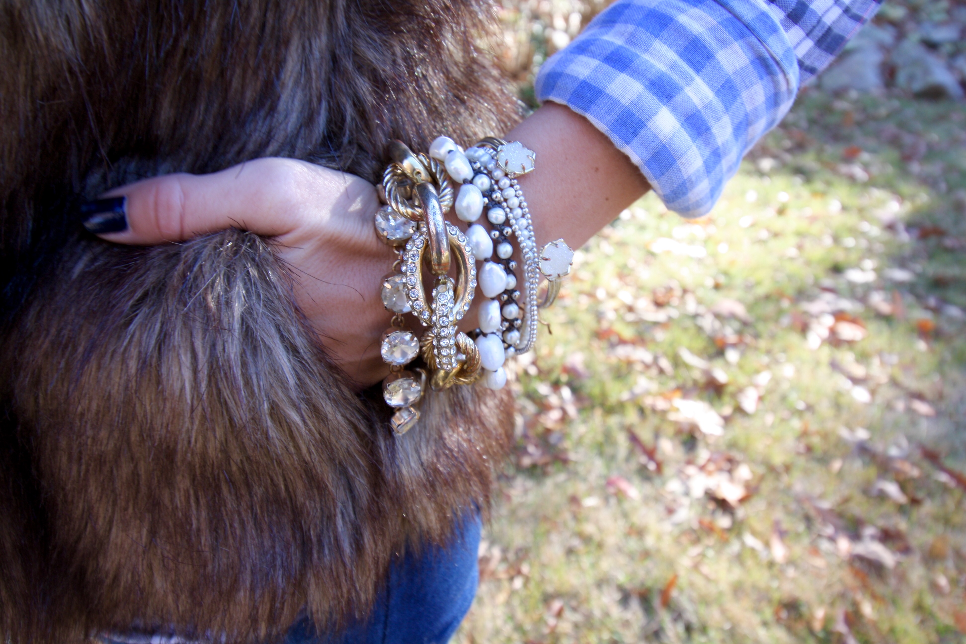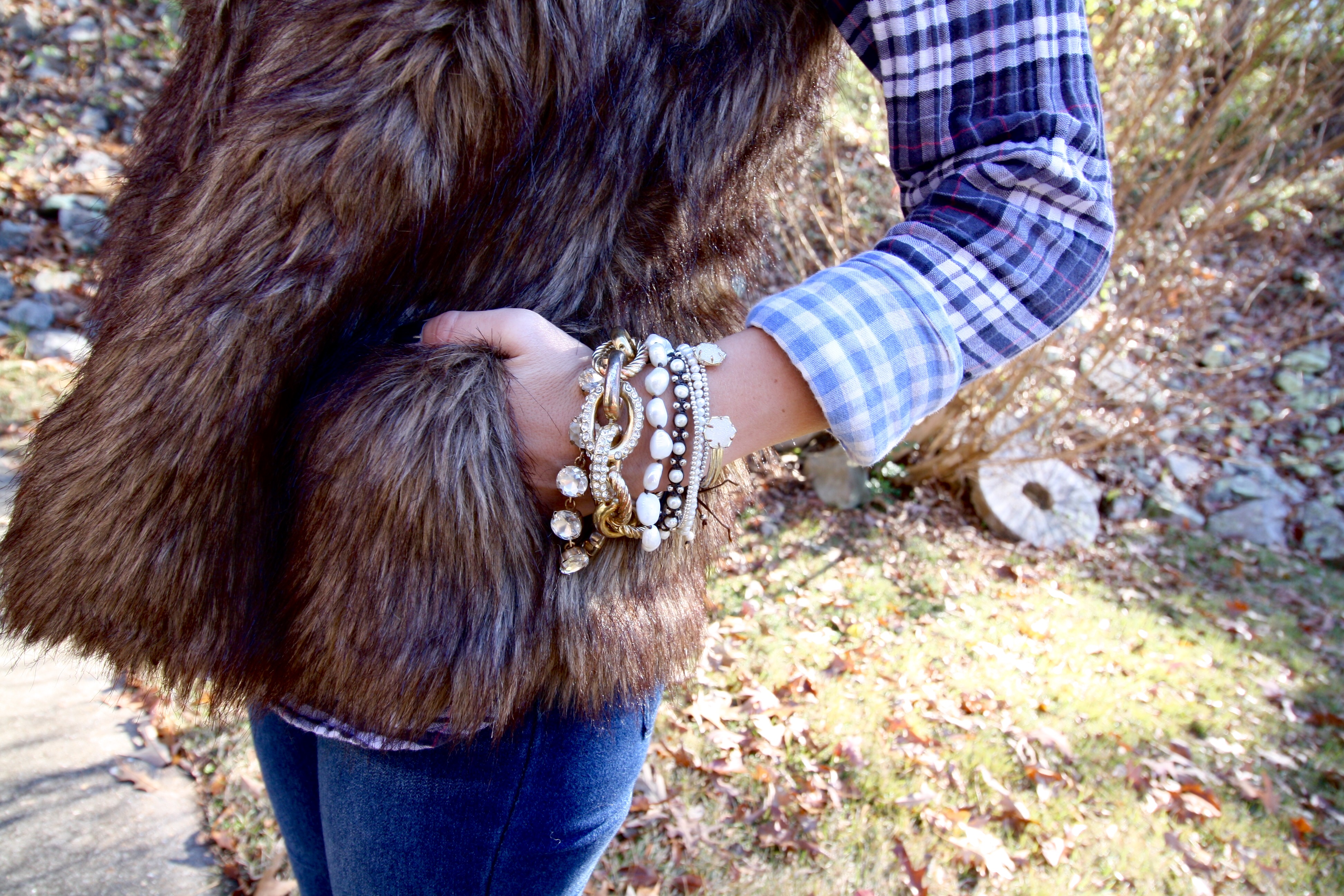 American Eagle shirt | Rue 21 faux fur vest (similar) | DKNY jeans | Corral boots (similar) | Kendra Scott Arden bracelet (similar) | Walmart link bracelet | J.Jill pearl bracelet | Rhinestone bracelet from local boutique Blue Brick Boutique