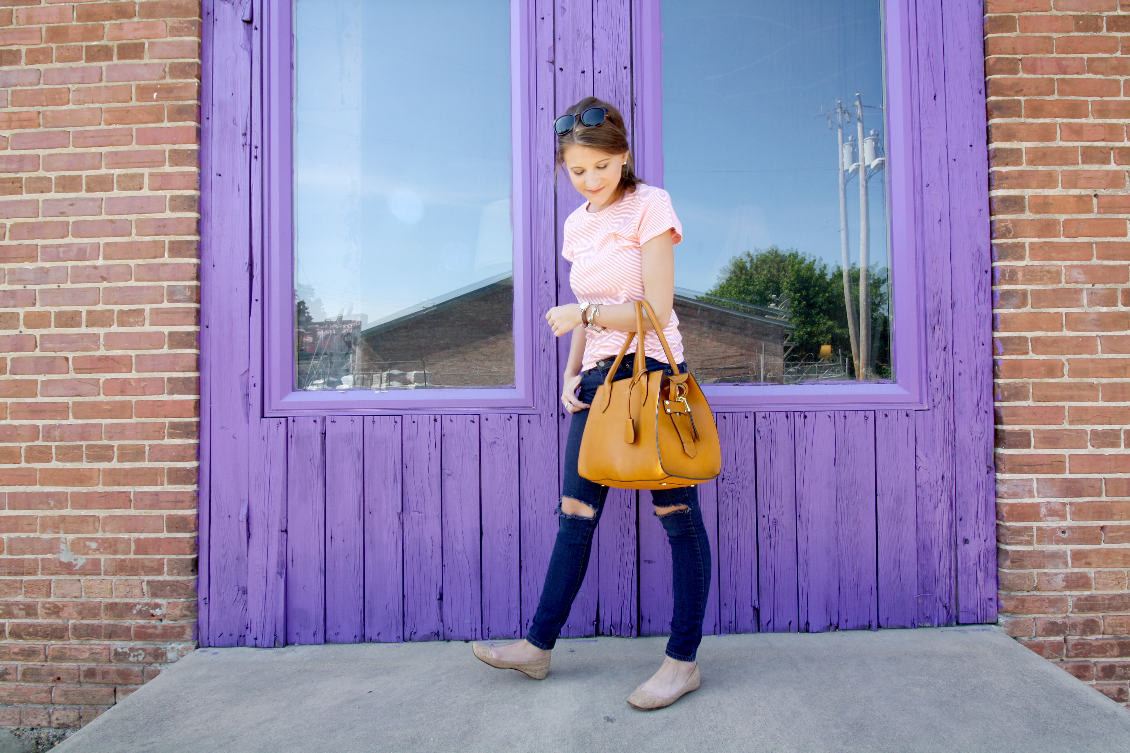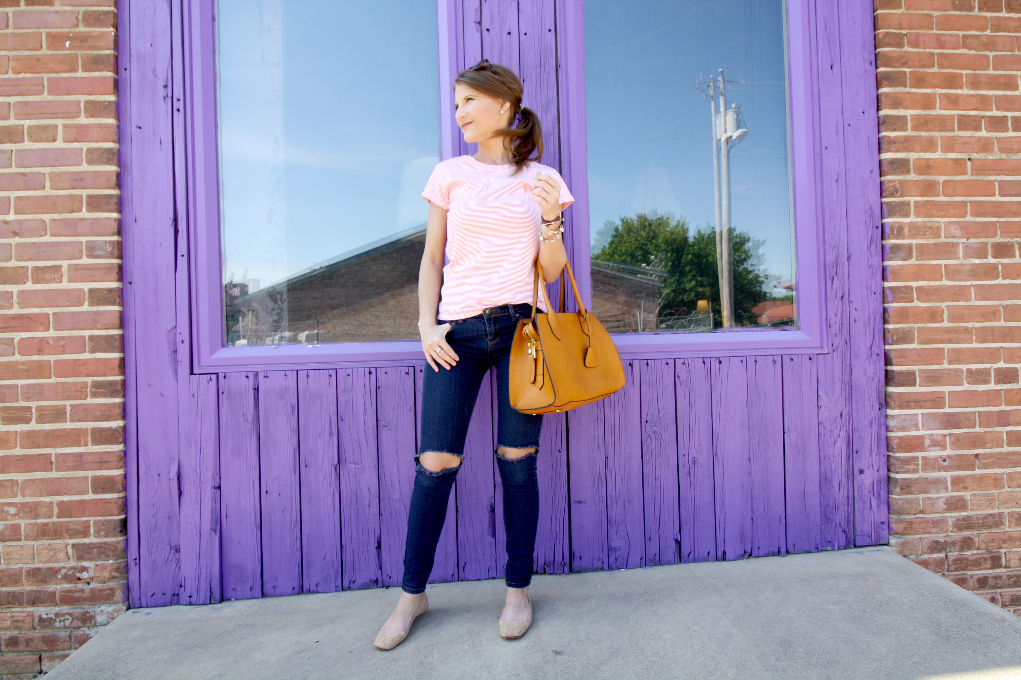 Every fashion girl has a go-to outfit for running around town that is both comfortable and effortlessly stylish. Distressed jeans are probably one of the easiest ways to add an air of informal relaxation to a look, and flats will let you walk ease and comfort throughout your busy day. Take a look at one of my go-to around town looks and then stick around for the details below!