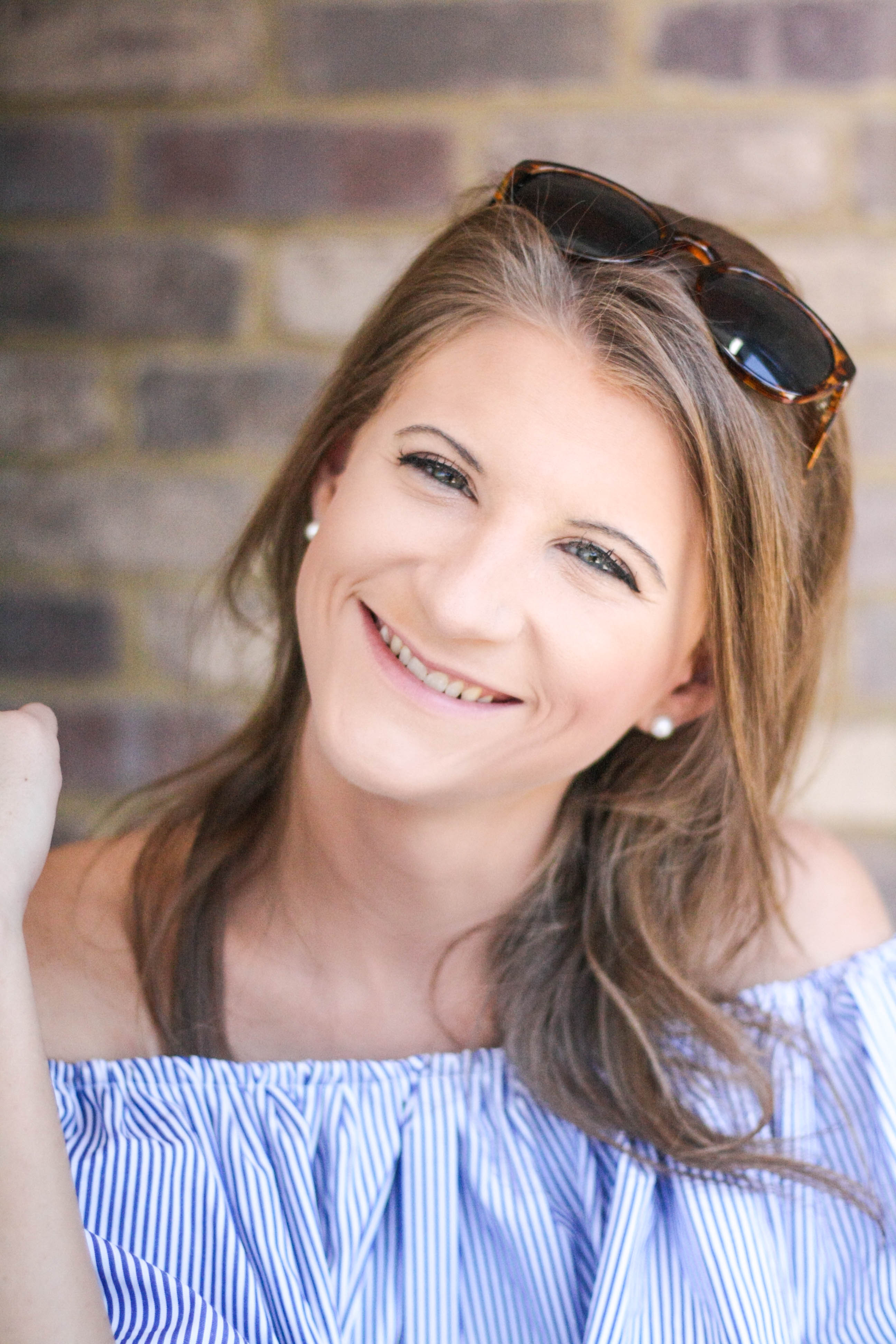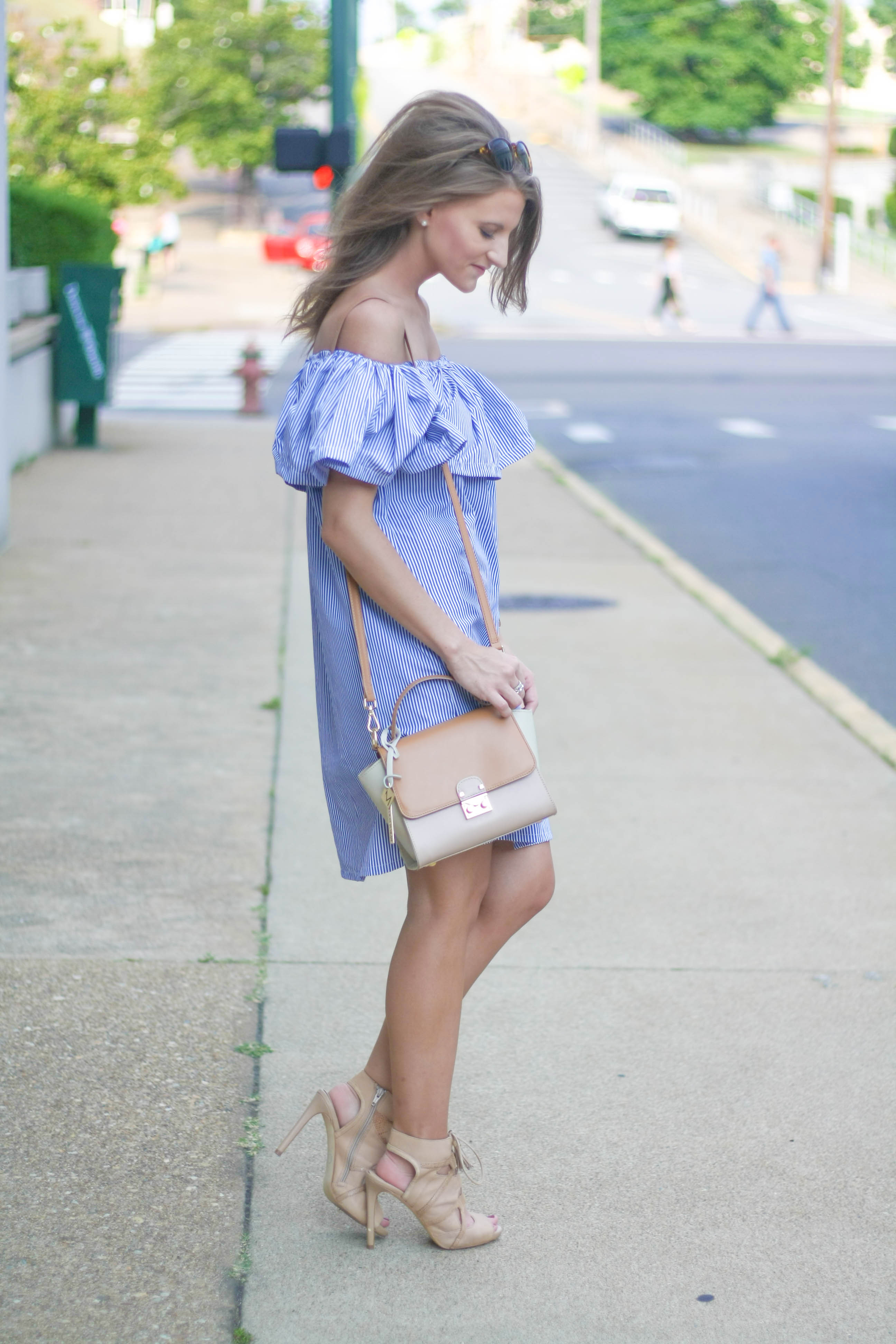 This cold shoulder dress is to die for!  Dainty stripes and a full, flouncy ruffle make this particular dress fun and seriously cute.  Whether you’re out for a day of shopping or going to brunch, it’s sure to wow.  See the full outfit and my brunch date at La Madeleine below!
