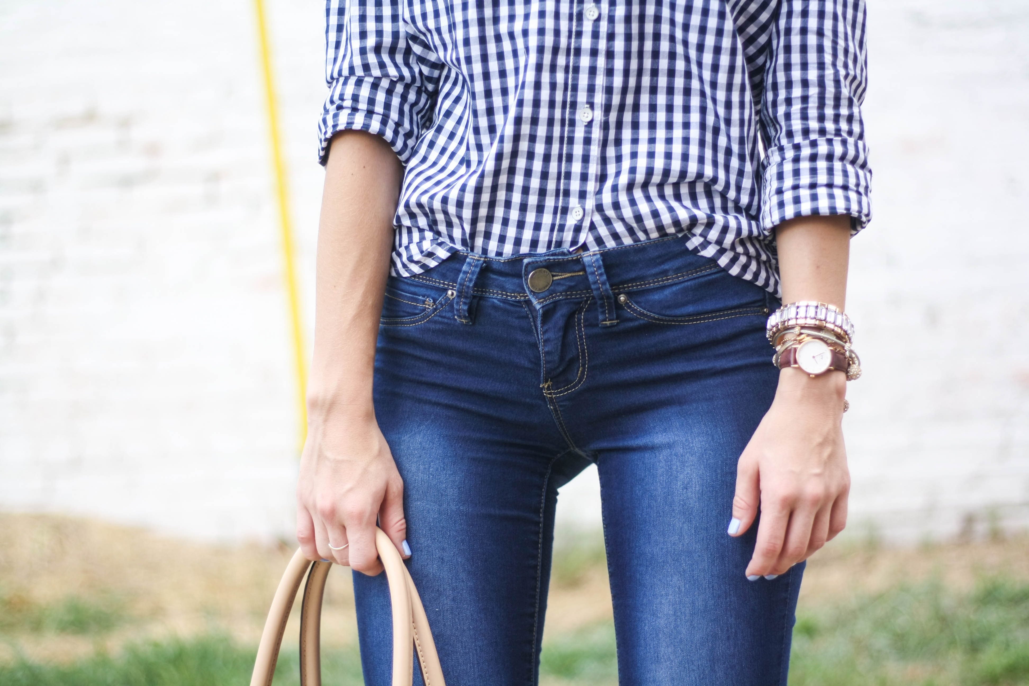 A gingham button down will never fail to impress. It’s versatility in color and wear has earned it an everlasting spot in the classic style category. I’ve seen the gingham button down paired with all manner of shorts, skirts, pants, and even dresses. With this outfit, I decided to keep it simple with skinny jeans. My almost briefcase style Kate Spade bag holds all of my summer essentials…and so much more. I jazzed up the outfit with shiny accessories and balanced out the bottom of the outfit with very simple nude flats.