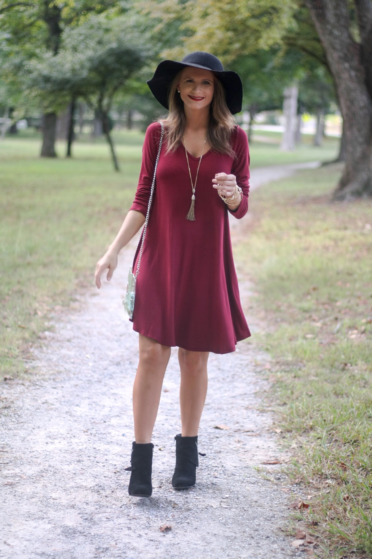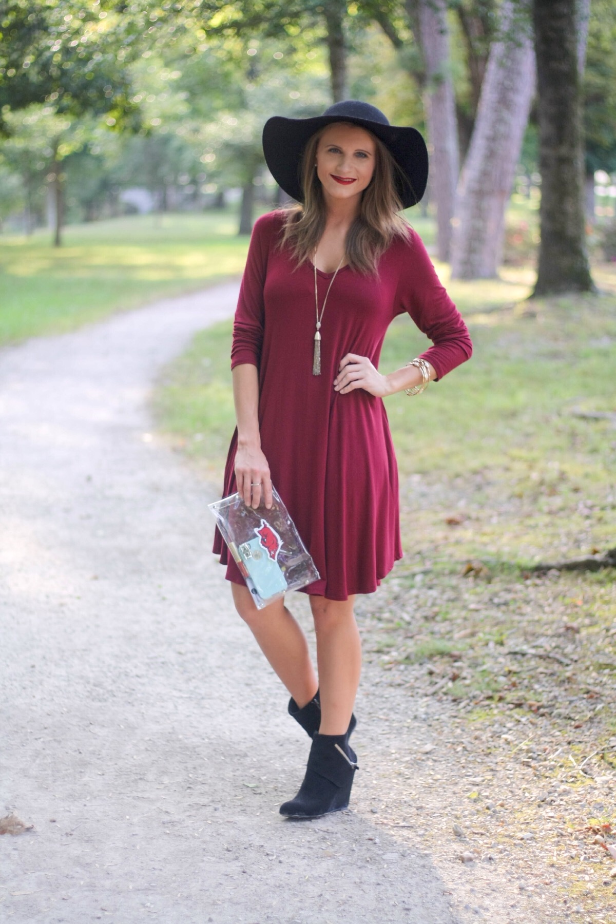 The ladies of the SEC are known for dressing to impress at football games. T-shirts and tennis shores are a rare sight at any game, but you will see quite a few dresses, heels, and cowboy boots! The dress I’m wearing is a trendy trapeze dress from the widely popular local boutique, Jeans and Java. I paired the dress with comfortable wedge booties (because walking through a stadium in heels can is absolute torture) and a floppy hair to keep my hair from being a mess in the wind and sun during a game.