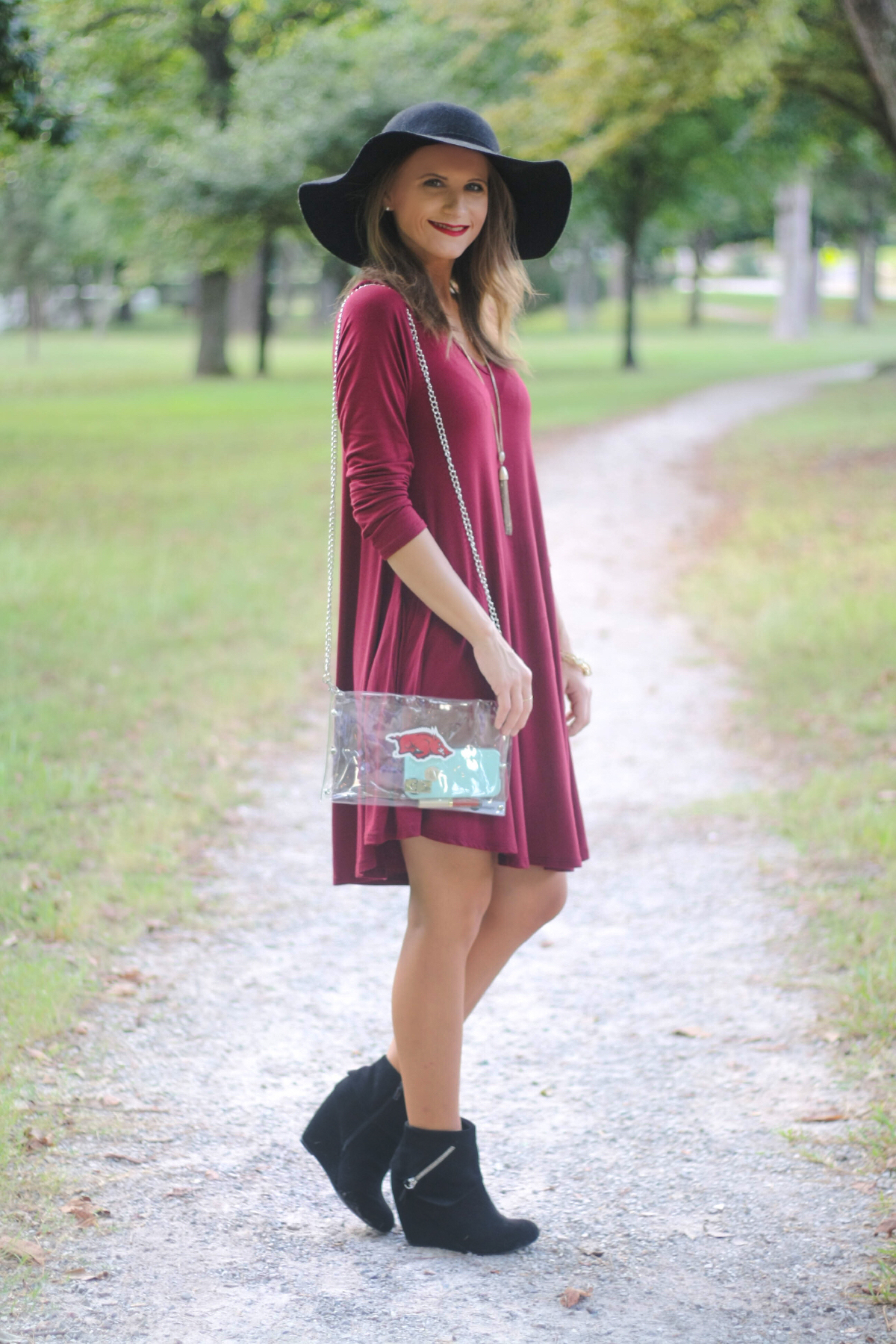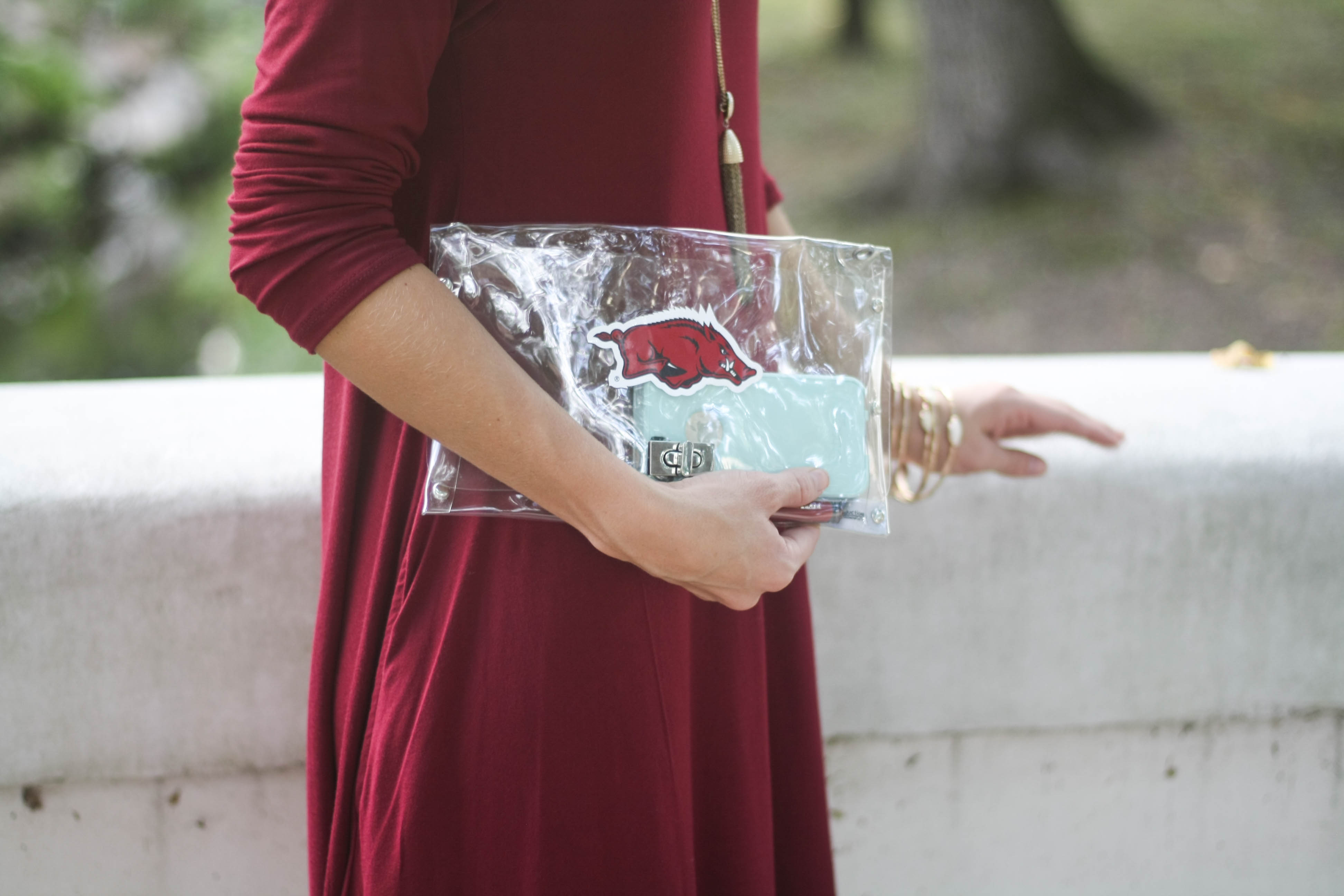 It’s no secret that no one does college football like the SEC! Thanks to growing up in Arkansas, “woo pig sooie” has been part of my vocabulary basically since I could talk. We love going to football games almost as much as we love our team. With many stadiums around the country, including the University of Arkansas, cracking down on safety by implementing clear bag policies, it’s getting harder for us SEC girls to keep up our tradition of dressing up for games. See my choice outfit for a Razorback game this season and the stadium-approved bag to go with it below!