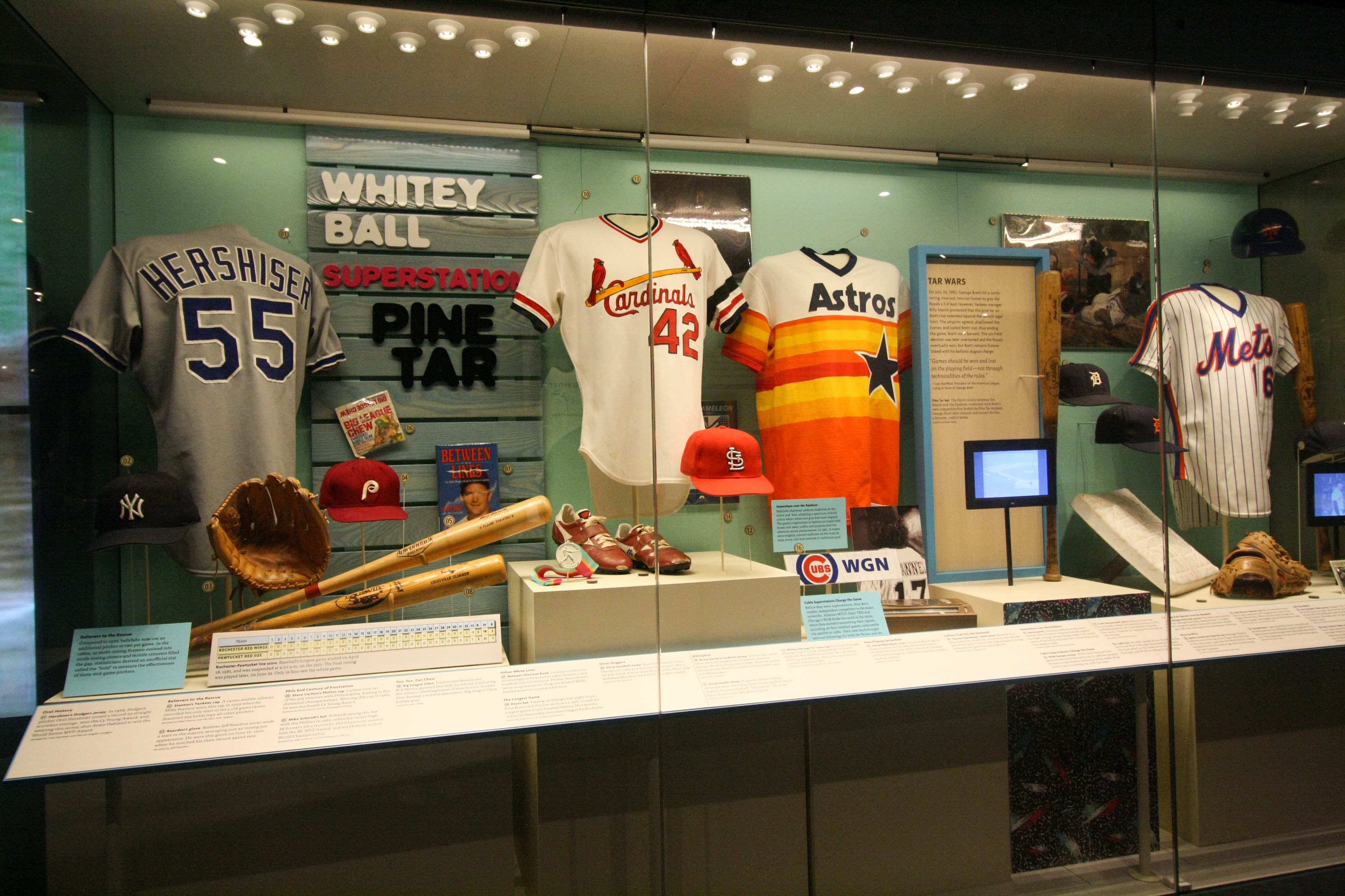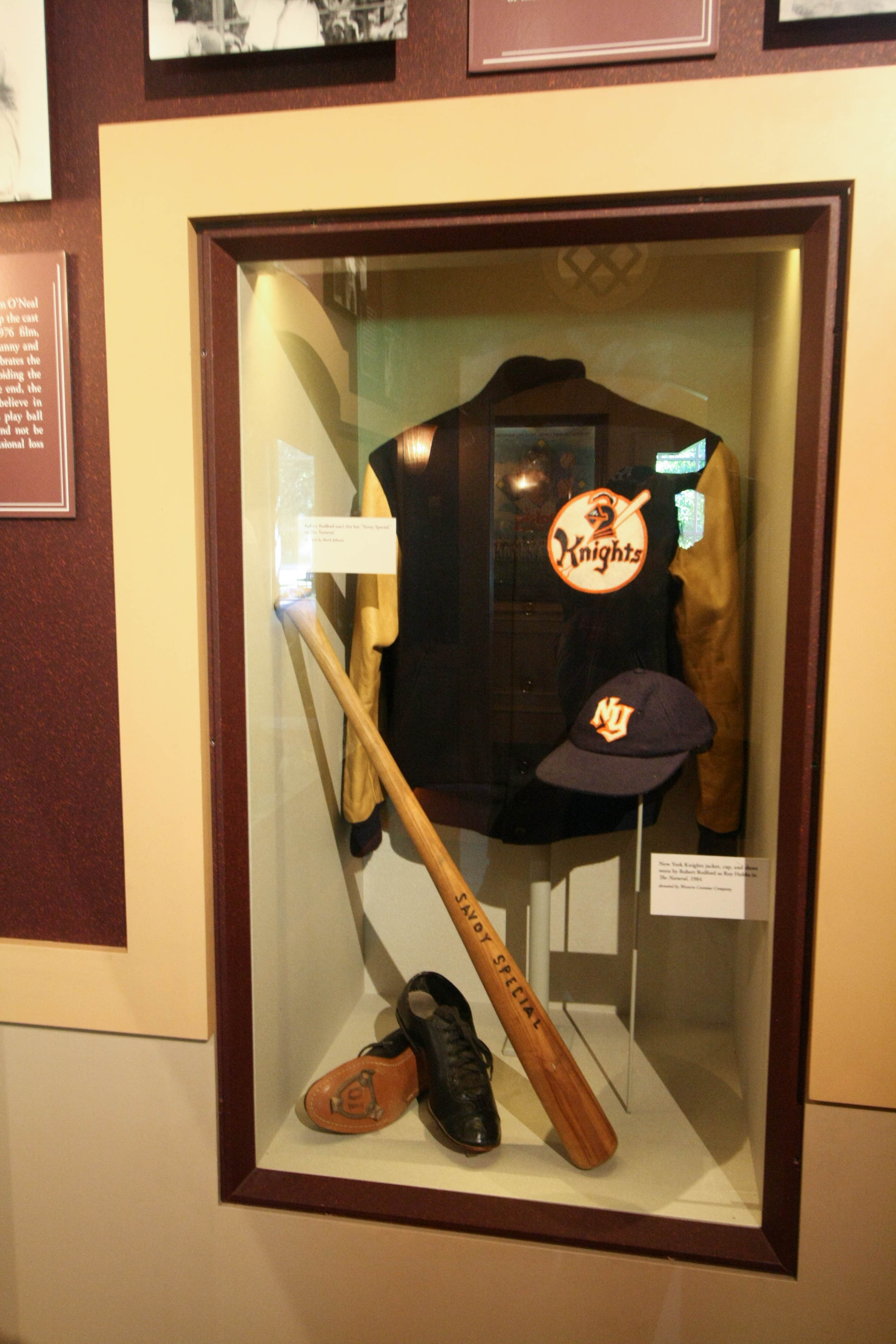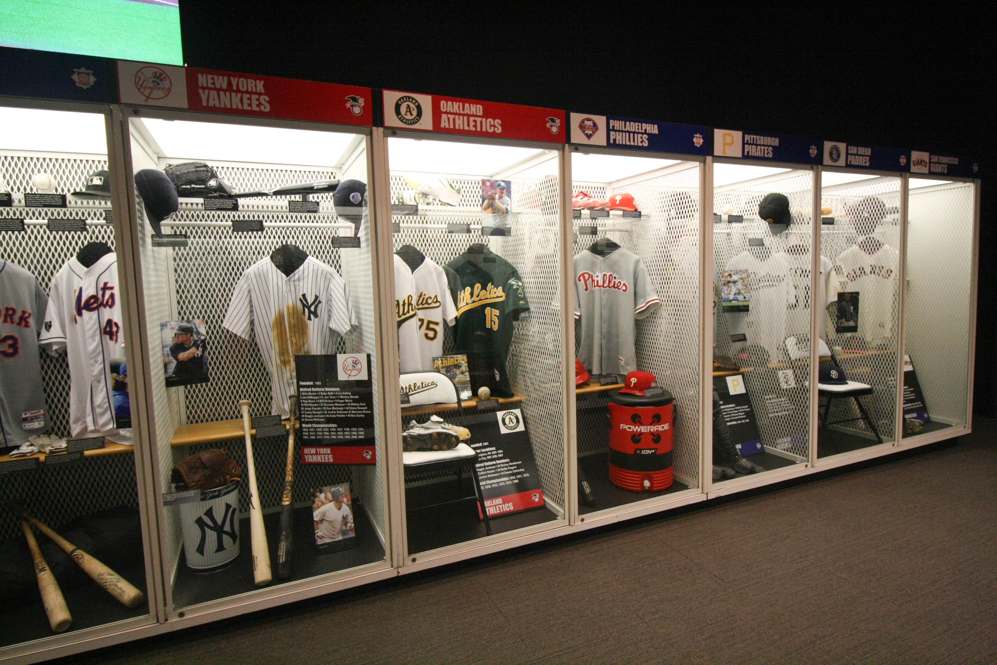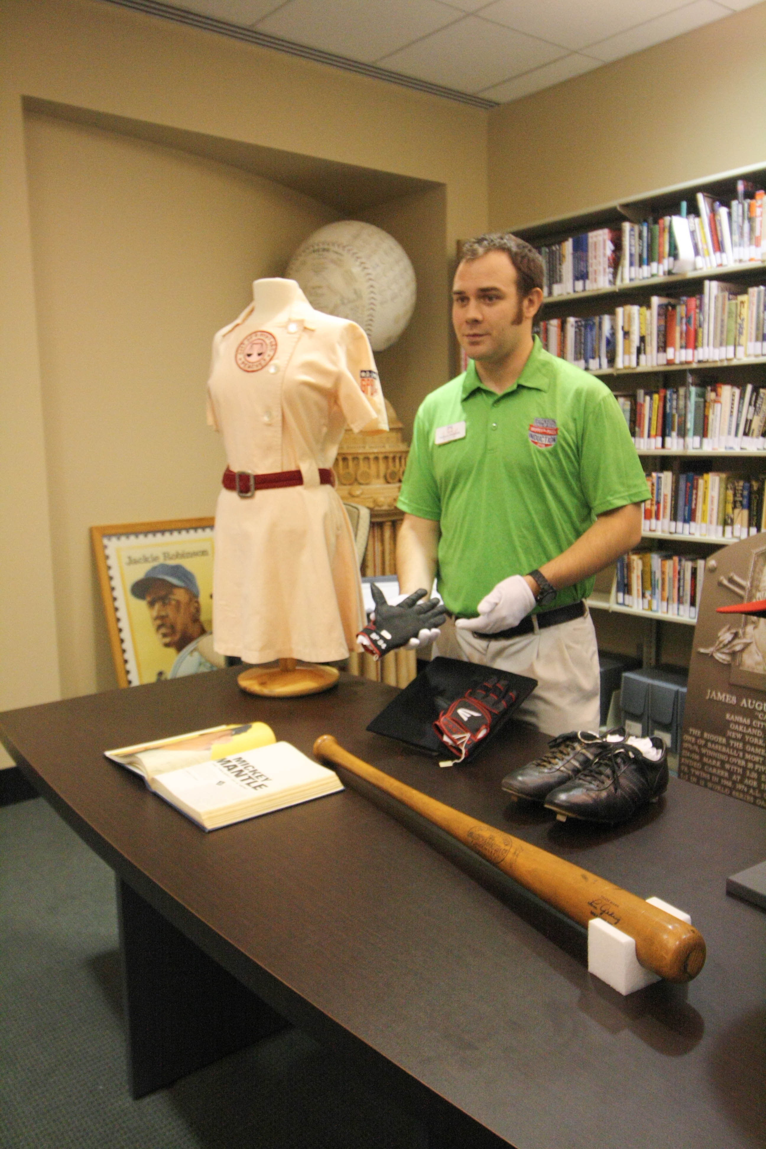 We were given a special look at a few items that are not currently on display in the Hall. On the table is Lou Gehrig’s bat, a costume uniform from the movie A League of Their Own, and David Ortiz’s gloves.