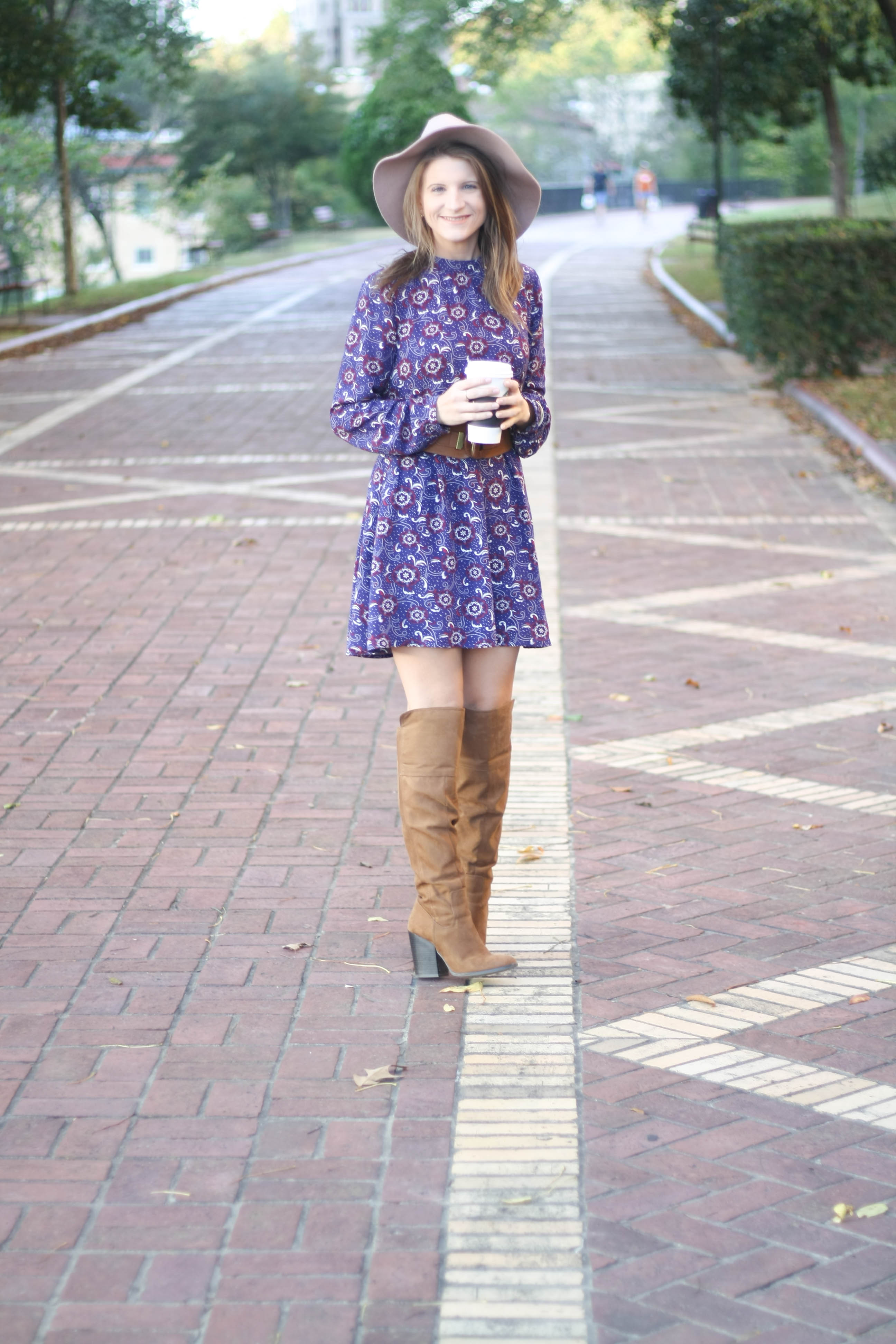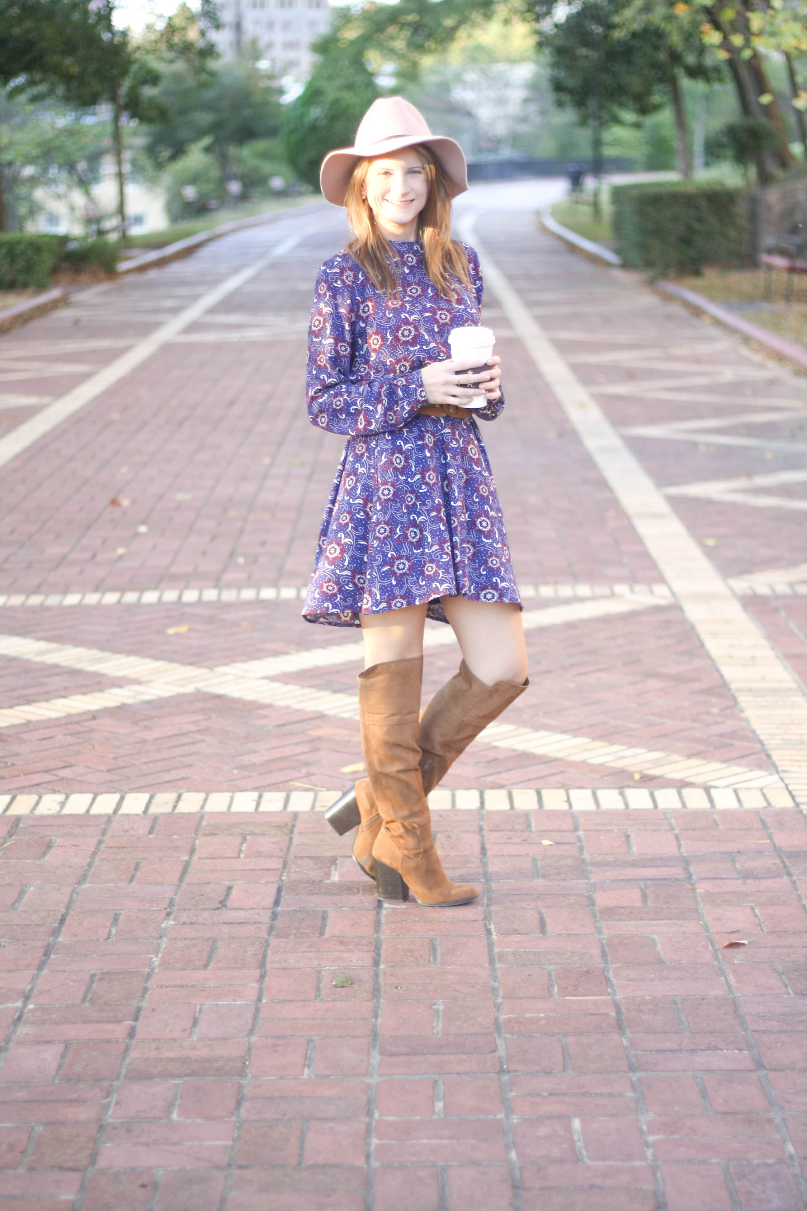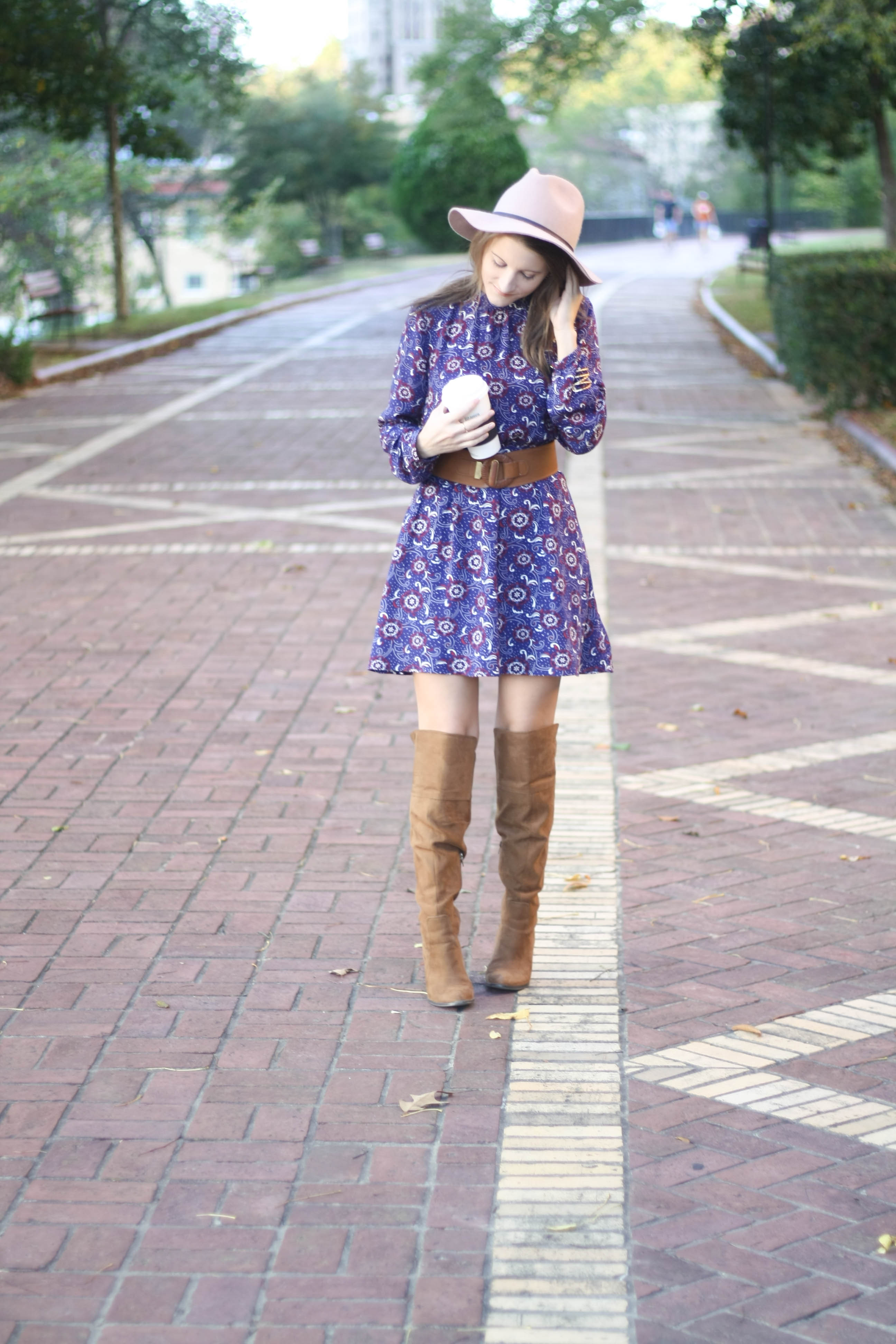 For this look, I chose brown knee-high suede boots because come on, it’s boots season.  A matching brown belt breaks up the busy print of the dress while accentuating my waist.  The hat doesn’t exactly match the belt and shoes, but I don’t mind because being too matchy-matchy is not a good look for me.