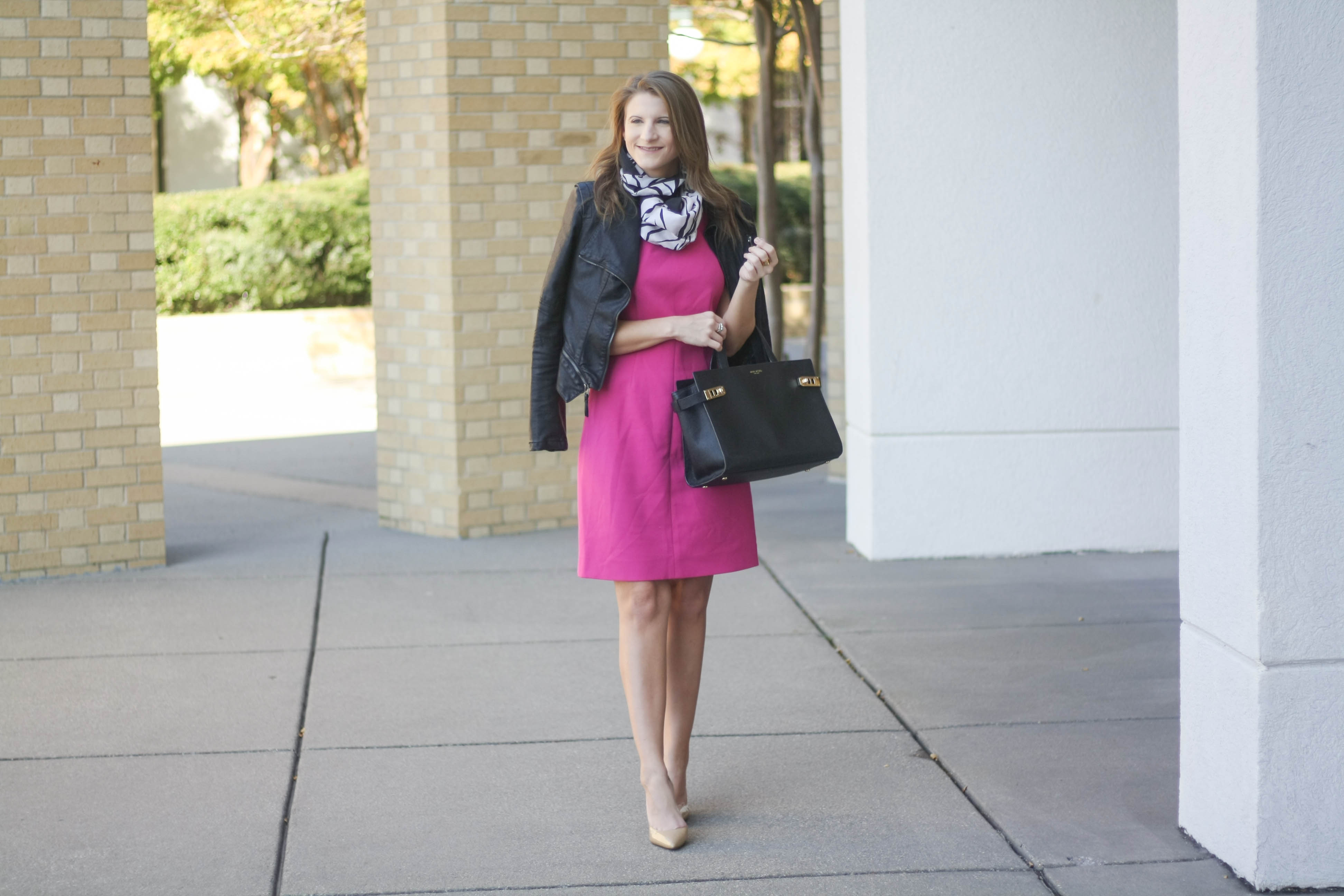 To combat the bright pink of the dress (which may not be some people’s cup of tea), I layered a black leather jacket for a bit of edge. To go for a softer look, a beige blazer would do the trick.