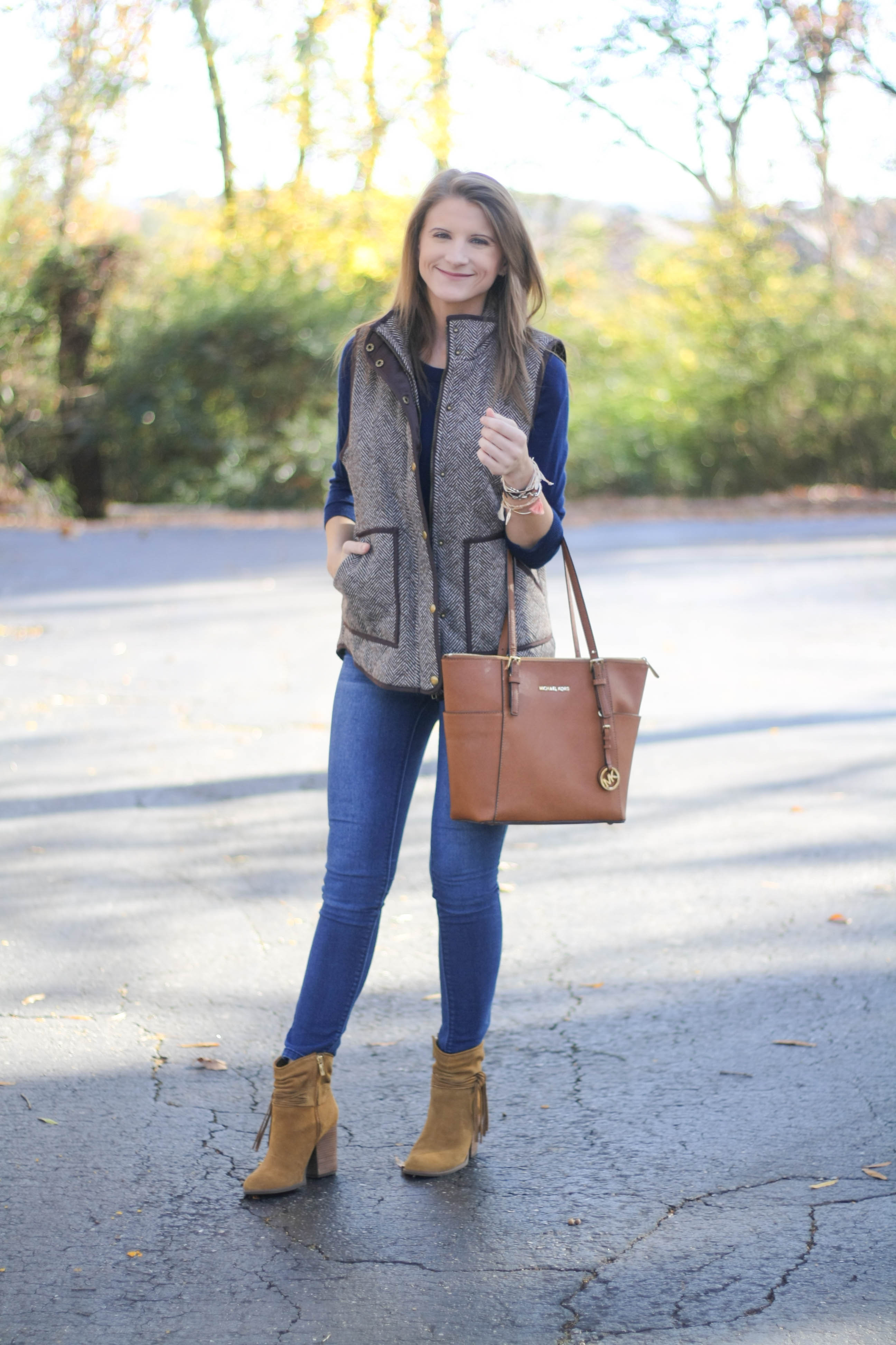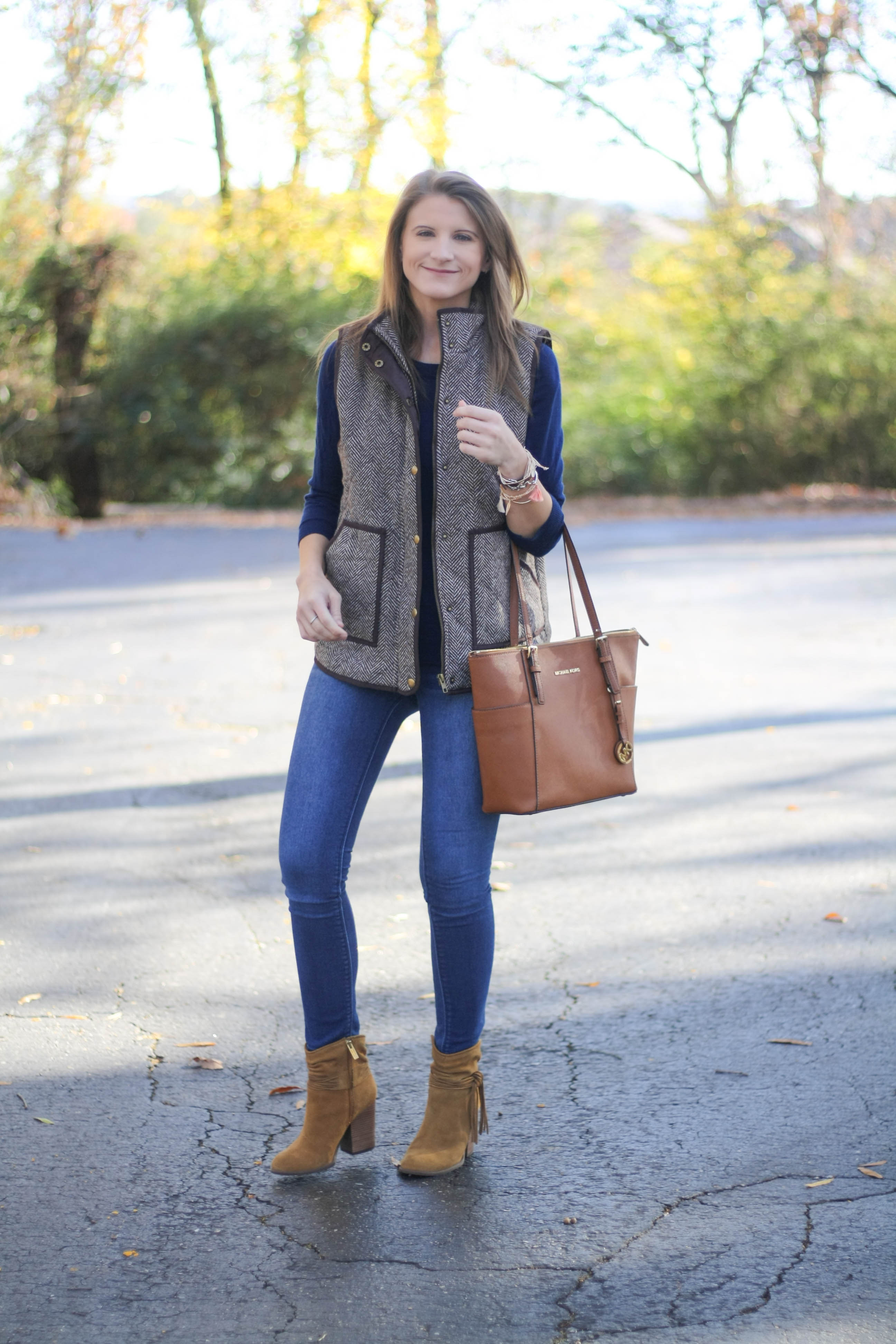 Sweater: J.Crew | Vest: Mack’s Prarie Wings (similar here & here) | Jeans: DKNY (similar) | Shoes: Jessica Simpson | Bag: Michael Kors | Watch: Daniel Wellington | Bracelets: Carolyn Hearn Designs