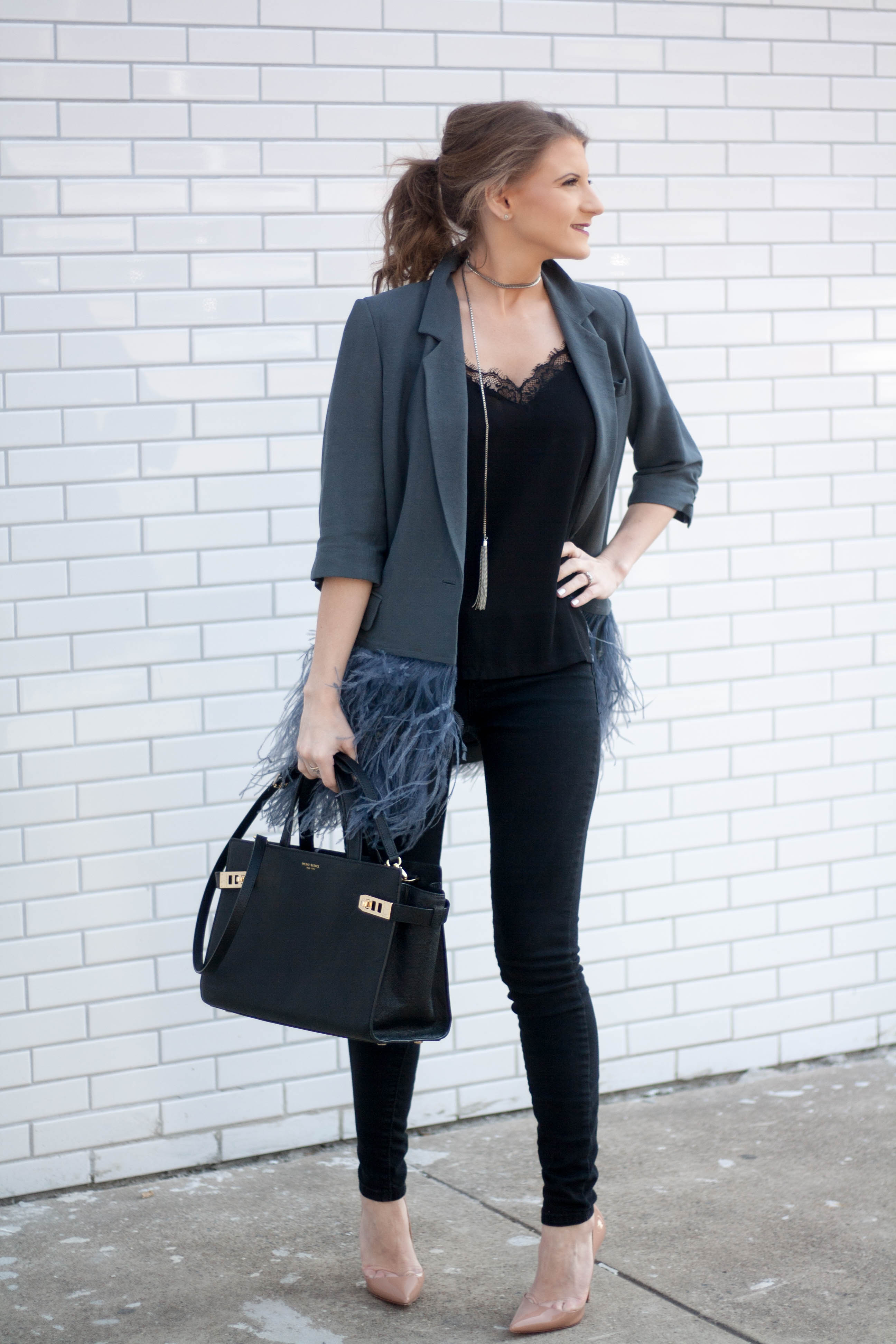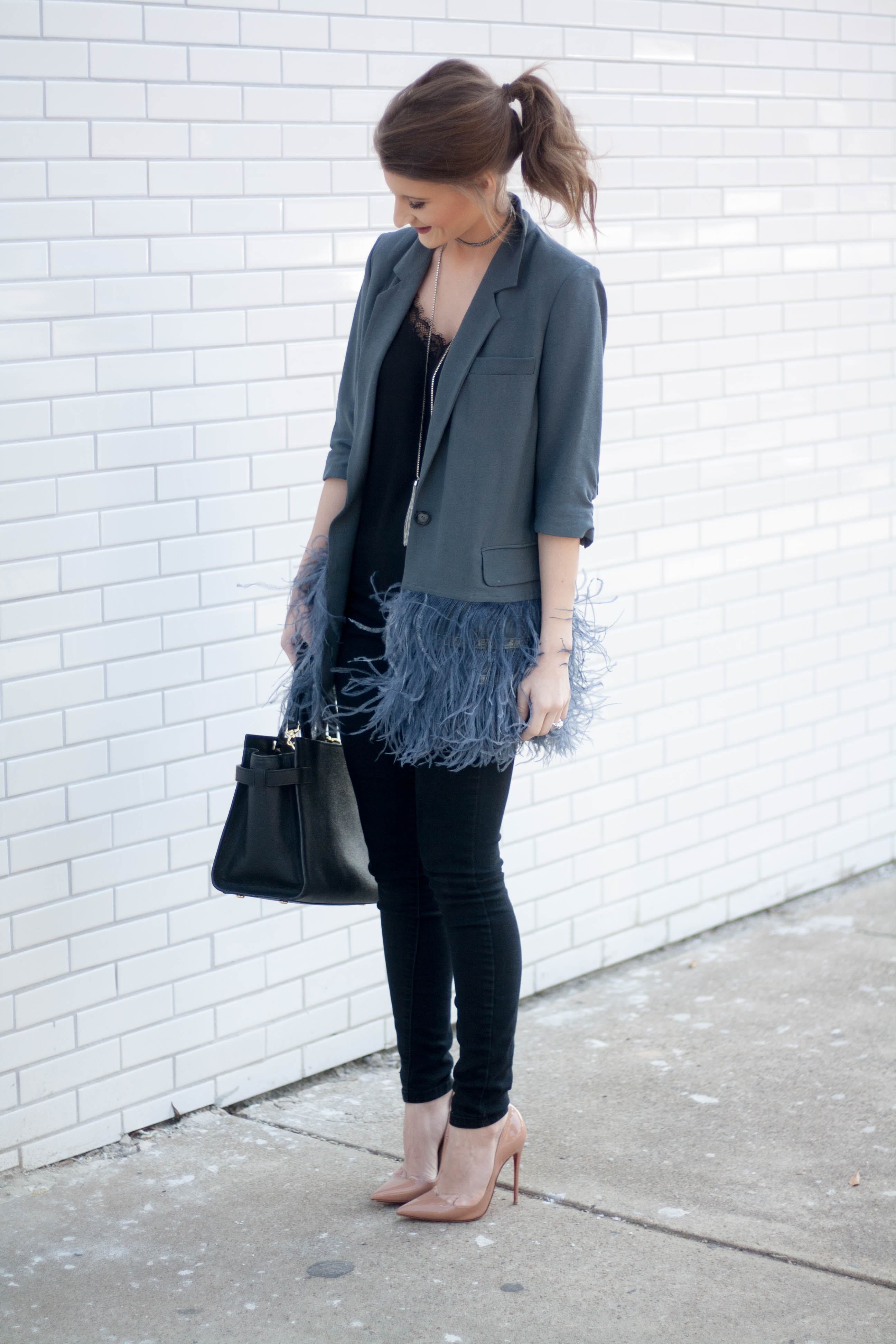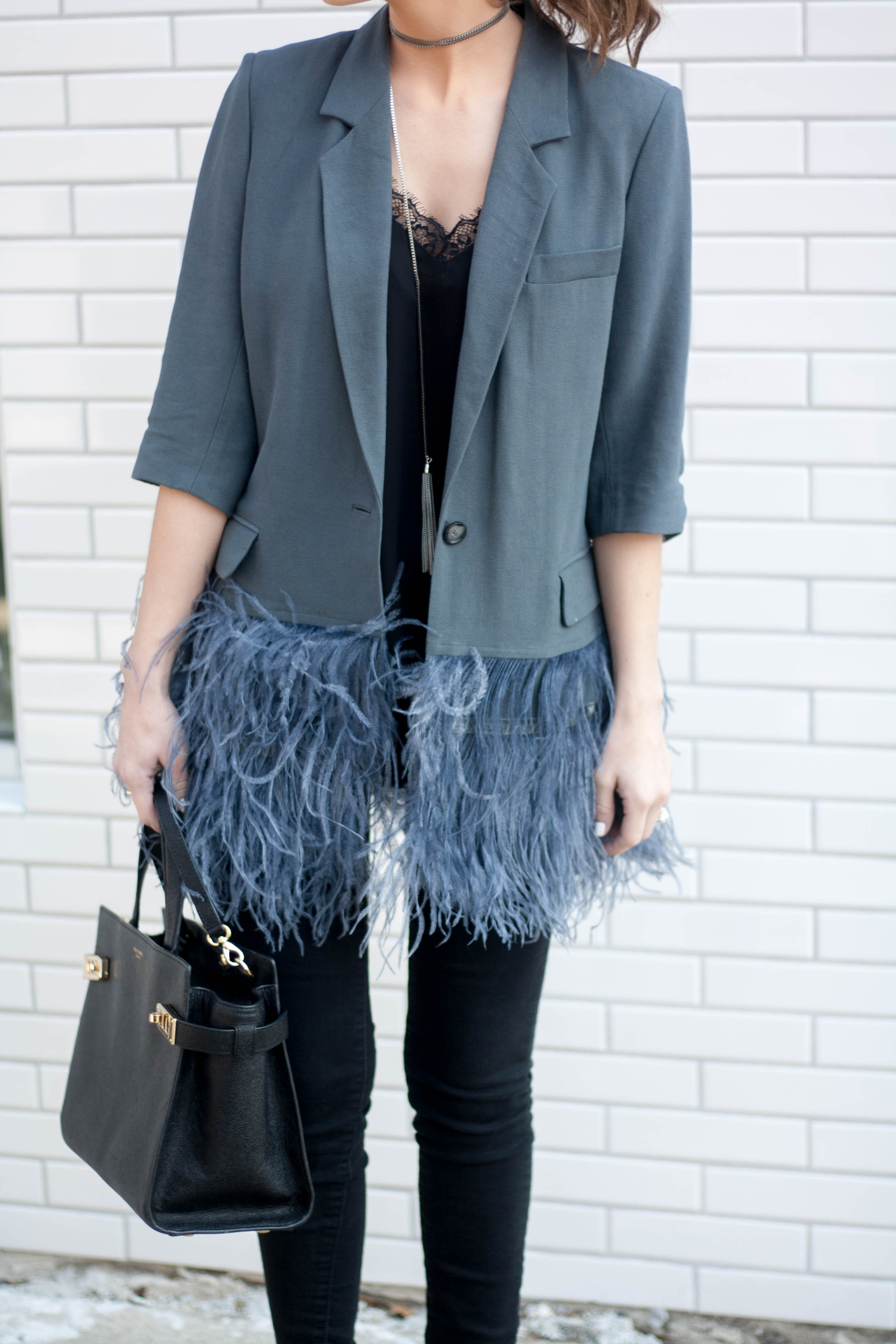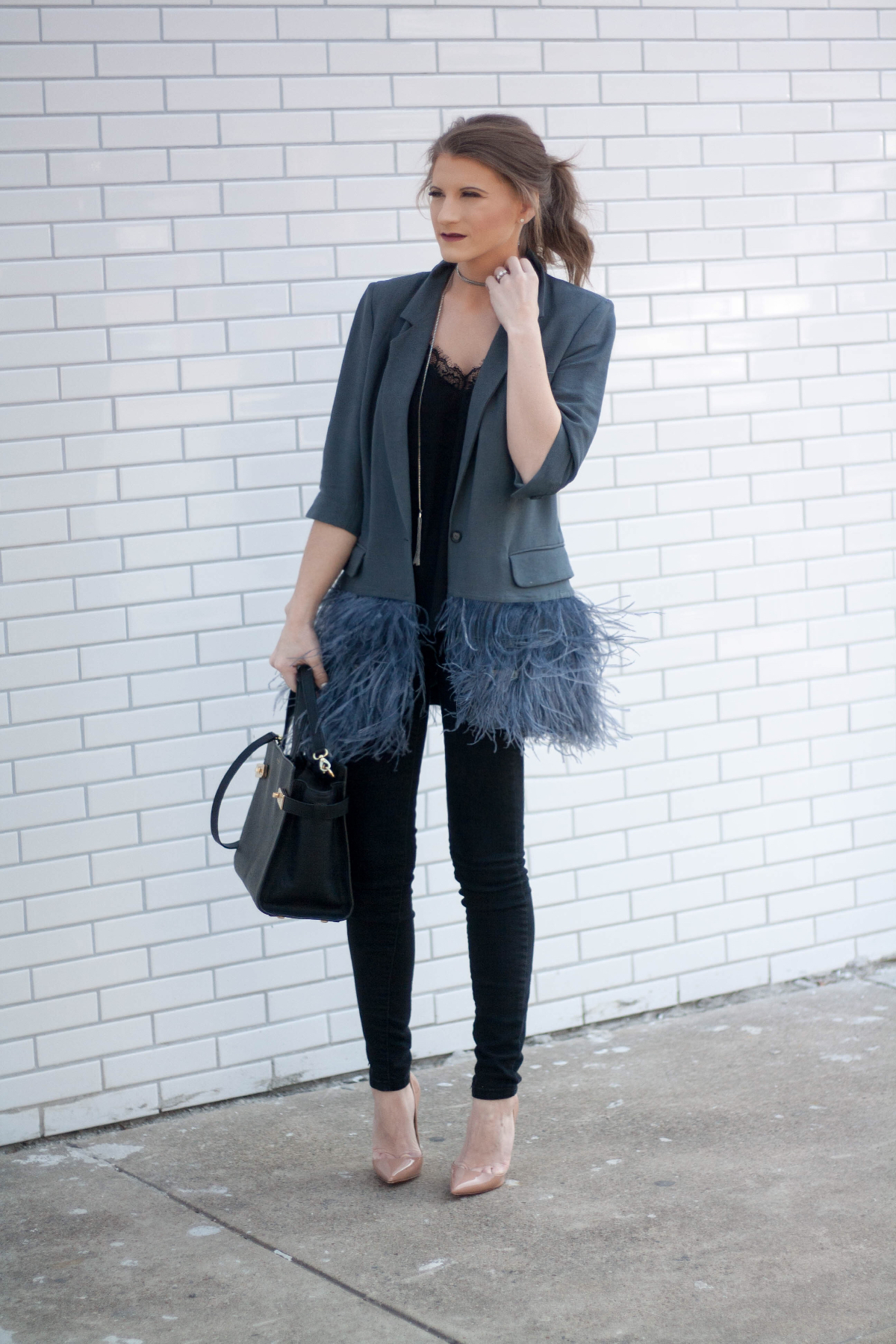 Add Elizabeth and James and feathers in the same collection and you have a recipe for the New York Fashion Week wardrobe. Before my fashion shows began on Saturday, I wore this ensemble featuring stunning E&J James feather trimmed blazer for a night on the town in NYC. Let’s just take a moment to stare in awe.