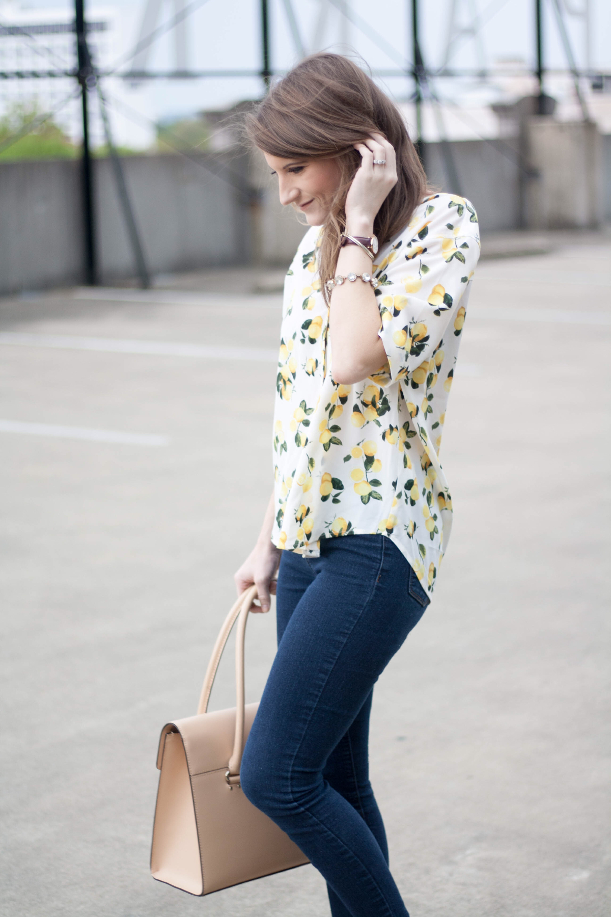 Lemons are appearing in prints all over the fashion world this spring and summer. Their bright sour/sweet color makes them the perfect motif for a classic spring-inspired look. The quarter button blouse is an absolute steal at $17 from TJ Maxx. The loose fit and soft material make it easy to wear in the ever-warming spring weather. I can wear this top with jeans, shorts, or I can tuck it into a pencil skirt for the office.