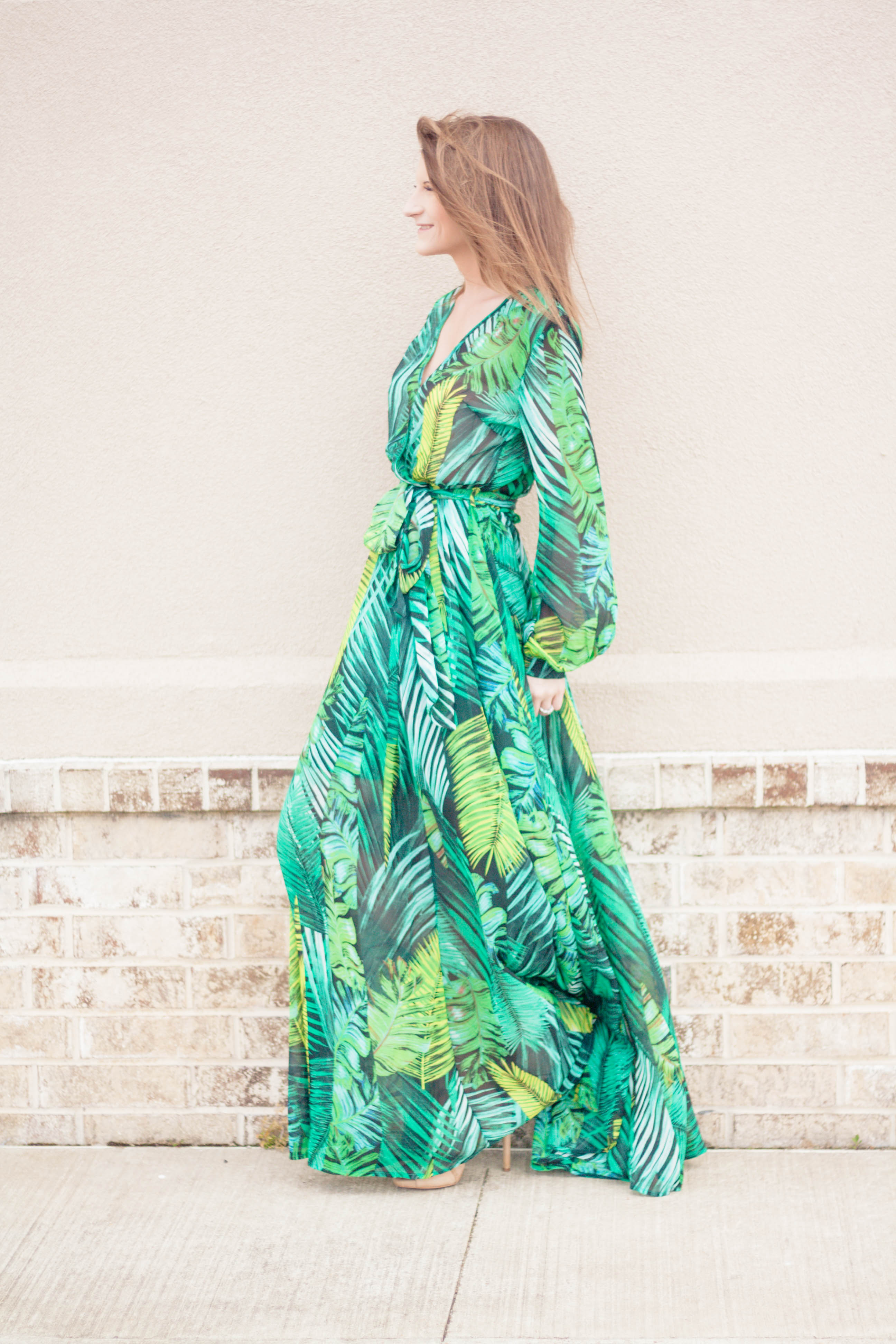 This gorgeous palm print maxi dress is what vacation dreams are made of. I would wear this on a night out to dinner alone the beach with heeled sandals and a long pendant necklace. I can’t tell you how obsessed with this dress I am!