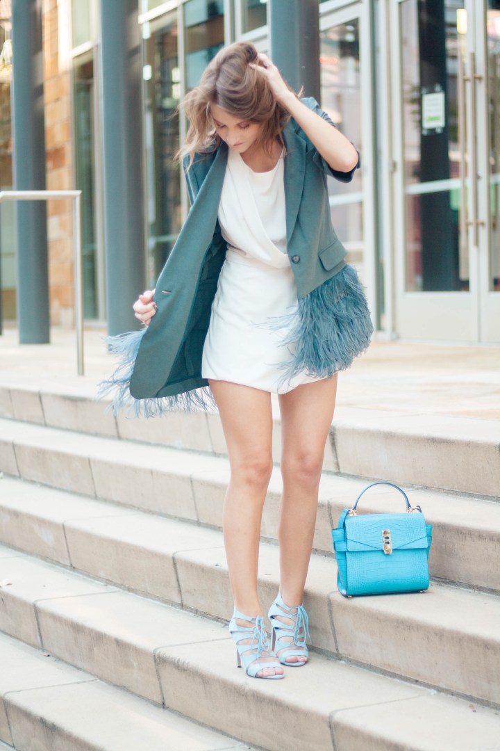 When wearing a statement piece as bold as a feather trimmed blazer, it’s best to go basic for your first layer. This faux wrap romper was my first ever romper. #throwback. I picked it up at Wet Seal, spending as little as possible on the style since I had no idea if it would flatter my body type or if I would like it. Spoiler: I fell in love. The romper is definitely an elevated style so it wasn’t difficult to envision the Elizabeth and James blazer over it. Although this romper is a few years old, white rompers can be found everywhere. My favorite is this one from Shoptiques.