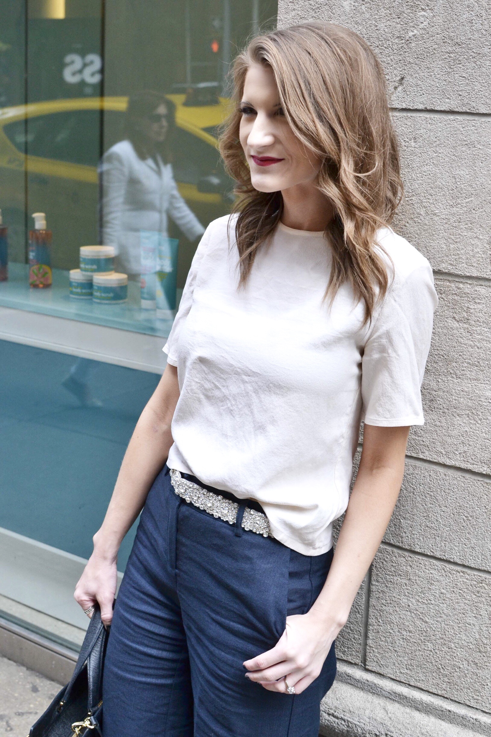 Top: Chanel (similar) | Pants: Versona (similar)| Shoes: Gianni Bini | Bag: Henri Bendel | Belt: Amazon