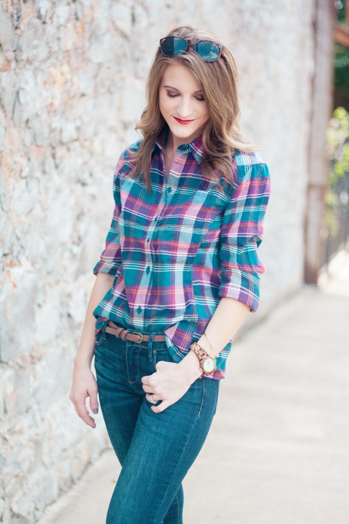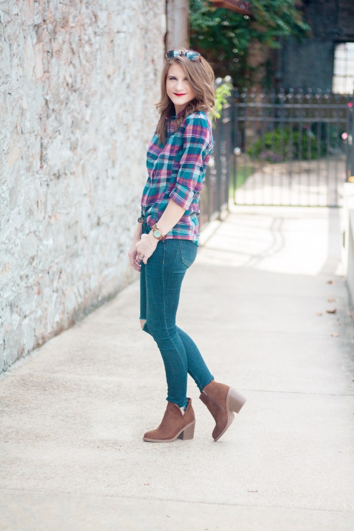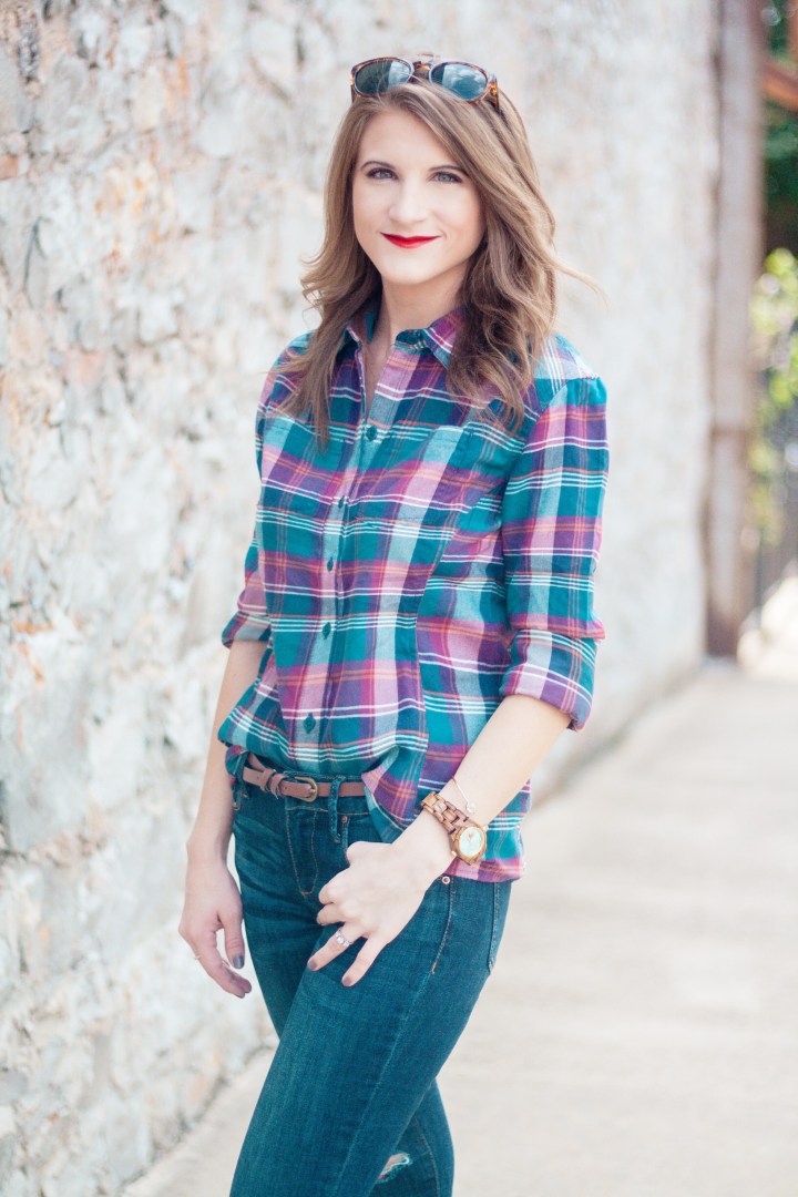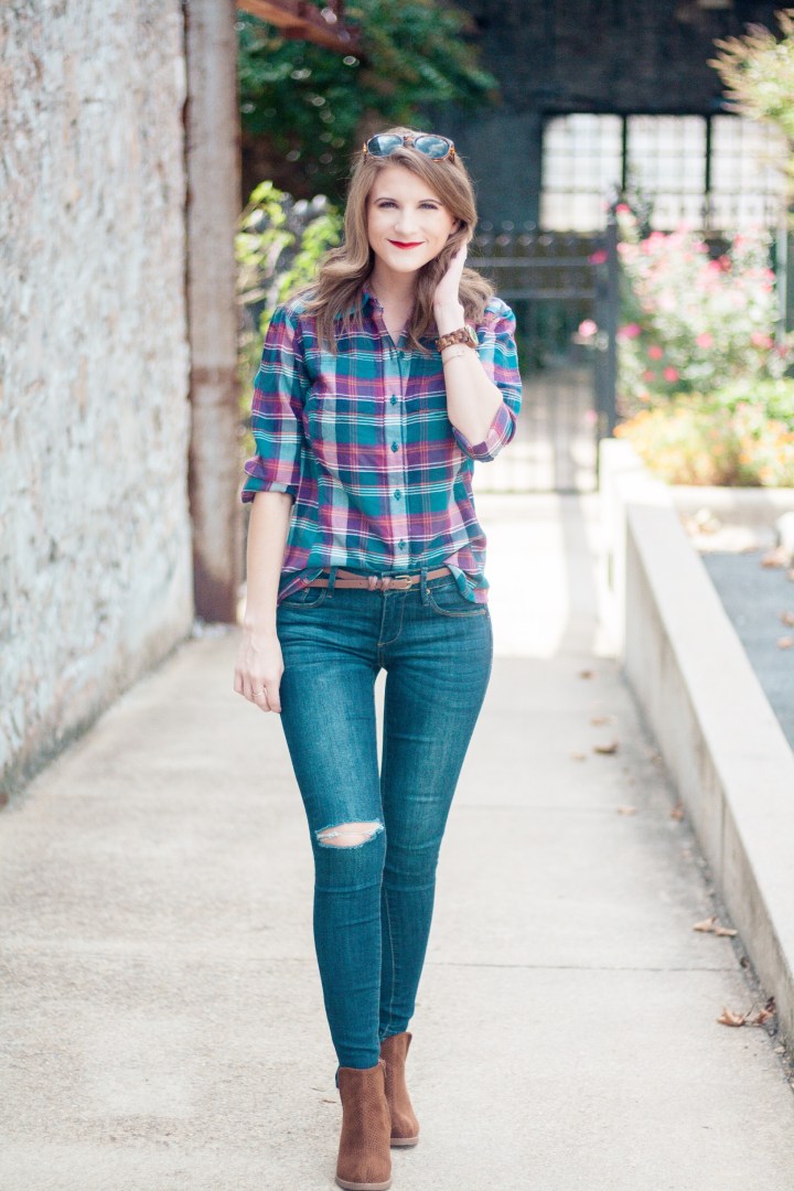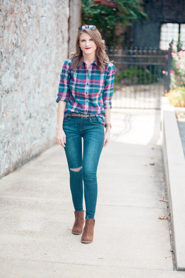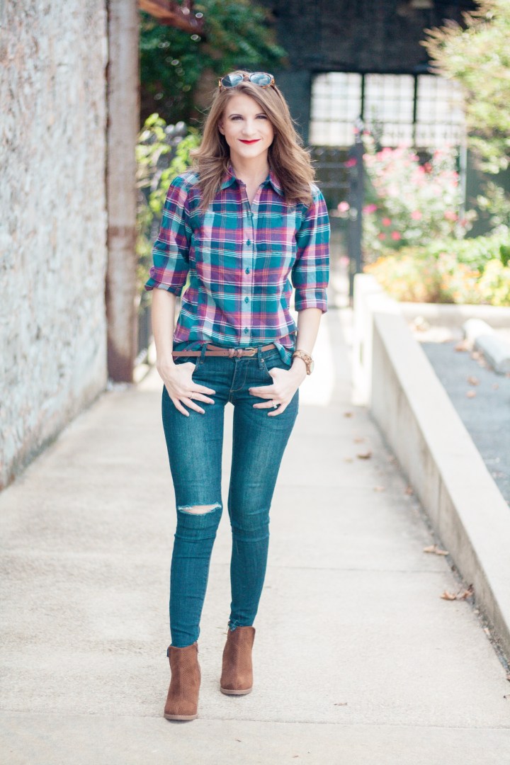 It’s finally starting to feel like fall in Arkansas! Temperatures dropped literally overnight and I can’t tell you how excited I am! Everything about fall makes me happy, especially fall fashion. A staple of my fall wardrobe are plaid shirts. LOTS of plaid shirts. Today I’m showing y’all how I’m wearing the latest addition to my plaid shirt collection. Scroll down to see all of the details!