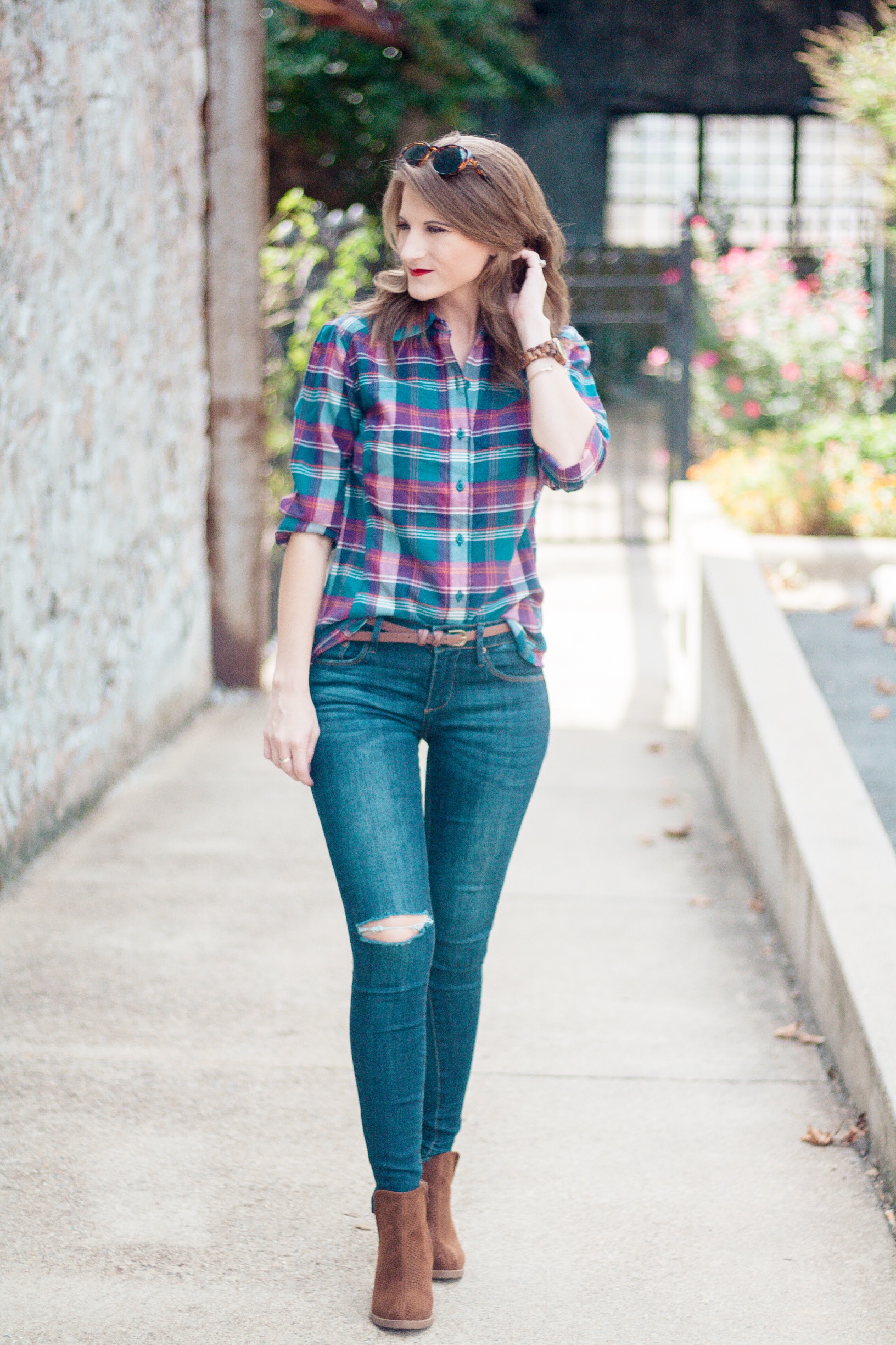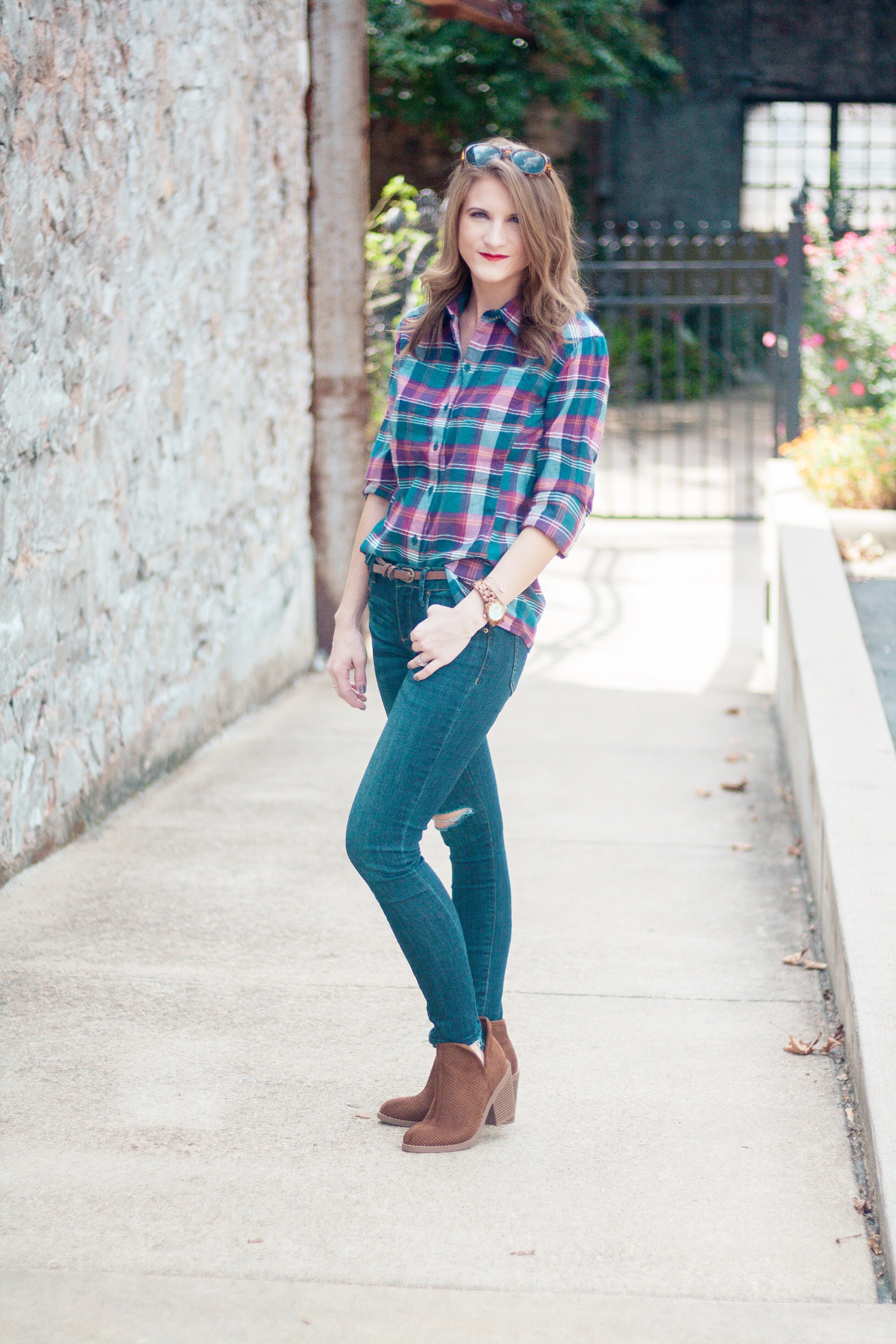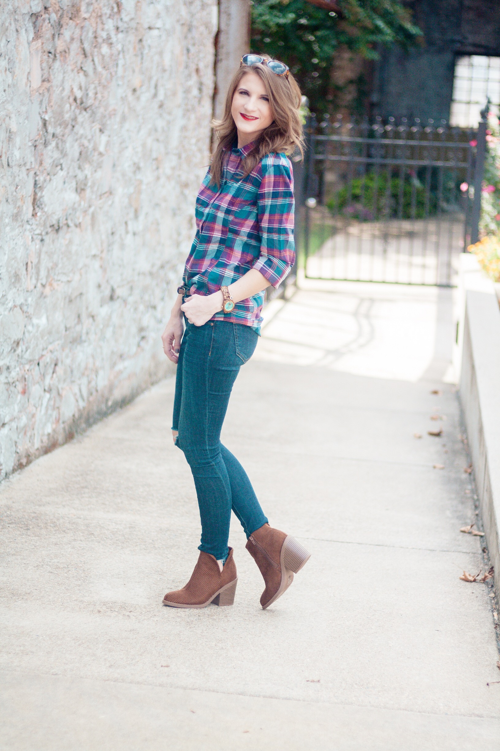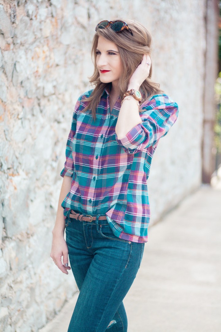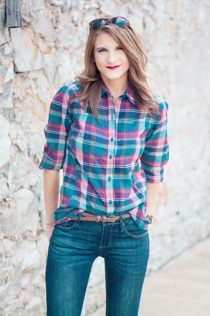 It’s finally starting to feel like fall in Arkansas! Temperatures dropped literally overnight and I can’t tell you how excited I am! Everything about fall makes me happy, especially fall fashion. A staple of my fall wardrobe are plaid shirts. LOTS of plaid shirts. Today I’m showing y’all how I’m wearing the latest addition to my plaid shirt collection. Scroll down to see all of the details!