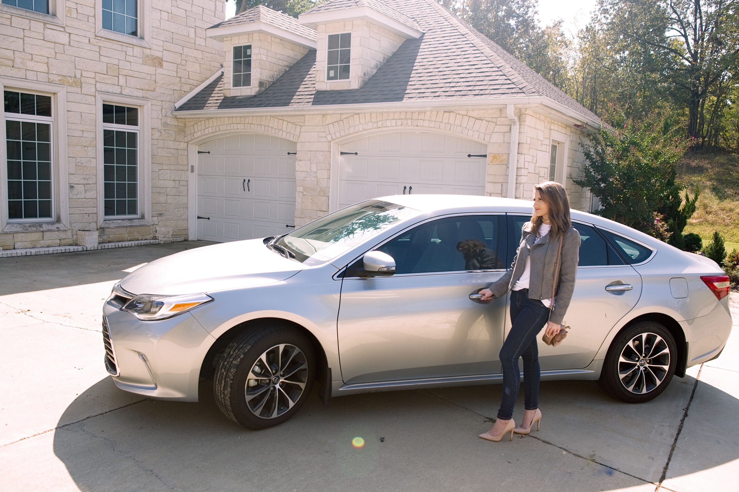 A graphic tee is relaxed and super easy to pair with a pair of dark wash skinny jeans. Fall weather is settling into Arkansas, so this Jack by BB Dakota light suede jacket is perfect for layering for when it gets chilly. Nude pumps for traveling may seem like a strange choice, but these by Guess are super comfortable. (I also kick them off when I’m in the passenger seat so I can really relax!)