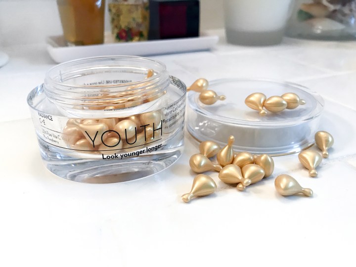 By far my favorite step in my touring is to apply the Youth Radiance C + E. The brightening formula is packaged in shining gold capsules that contain just the right amount for one night’s use. The cream brightens and tightens the skin to reduce fine lines and wrinkles. Even though I’m only 25, I’m starting to get fine lines directly under my eyes. (I blame the excessive amount of smiling I do on a daily basis for those!) So I focus the formula under my eyes to make the lines less noticeable.