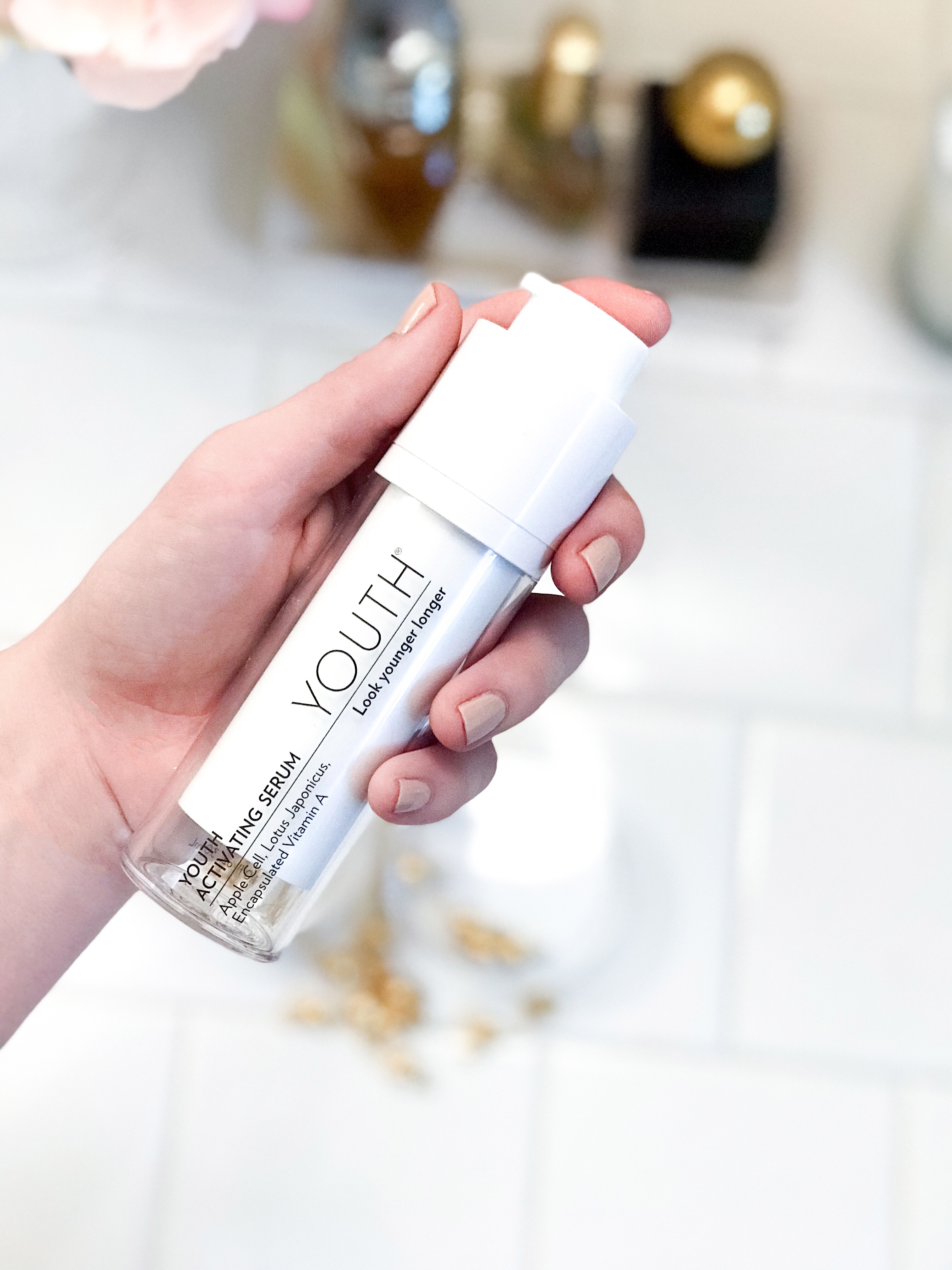 Next, I apply the Youth Activating Serum over my entire face. The Activating Serum renews and rejuvenates my skin each night on a cellular level. It contains Apple Cell, Lotus Japonicus, and Encapsulated Vitamin A that makes my skin look nourished when I wake up in the morning.