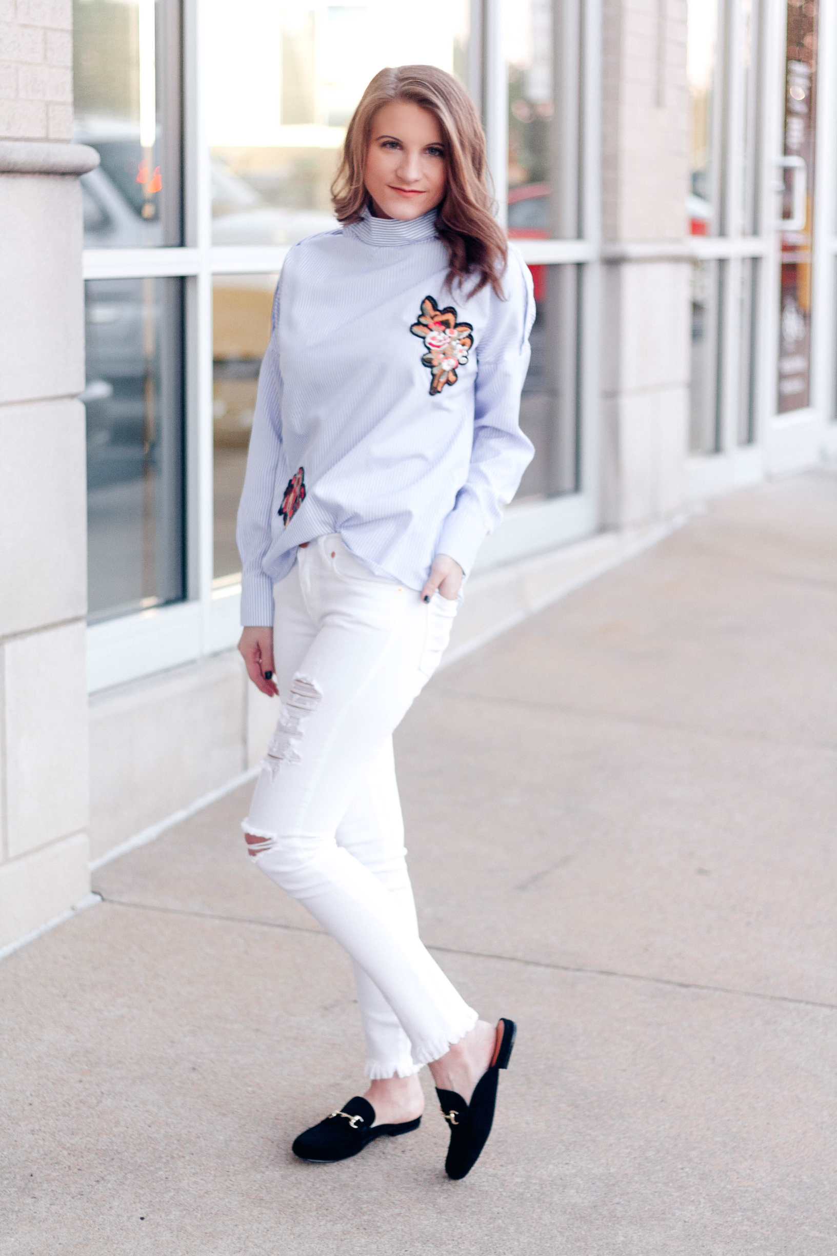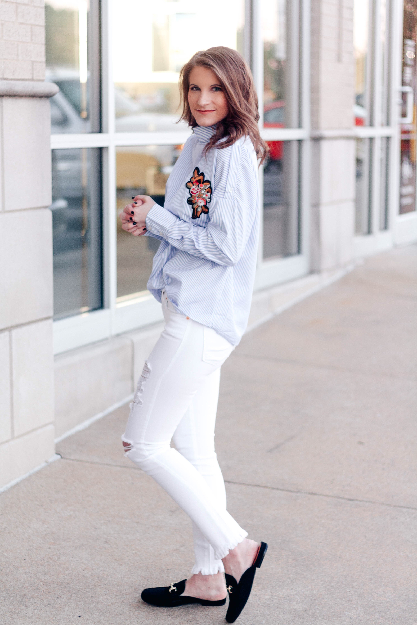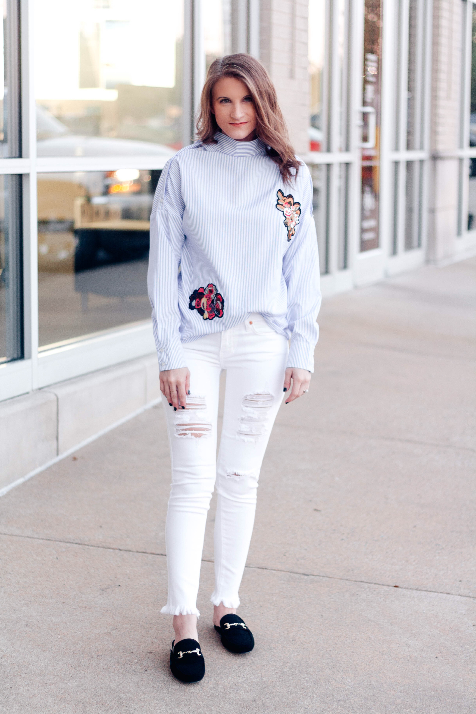The last look is by far my favorite. The blue and white striped shirt is decorated with dark, floral embroidery. A still collar and cuffs elevate the top even more by giving it a professional, structured feel. I paired the top with distressed white jeans with unfinished hems (yes, white after Labor Day!) and black mules with gold horse bit hardware.