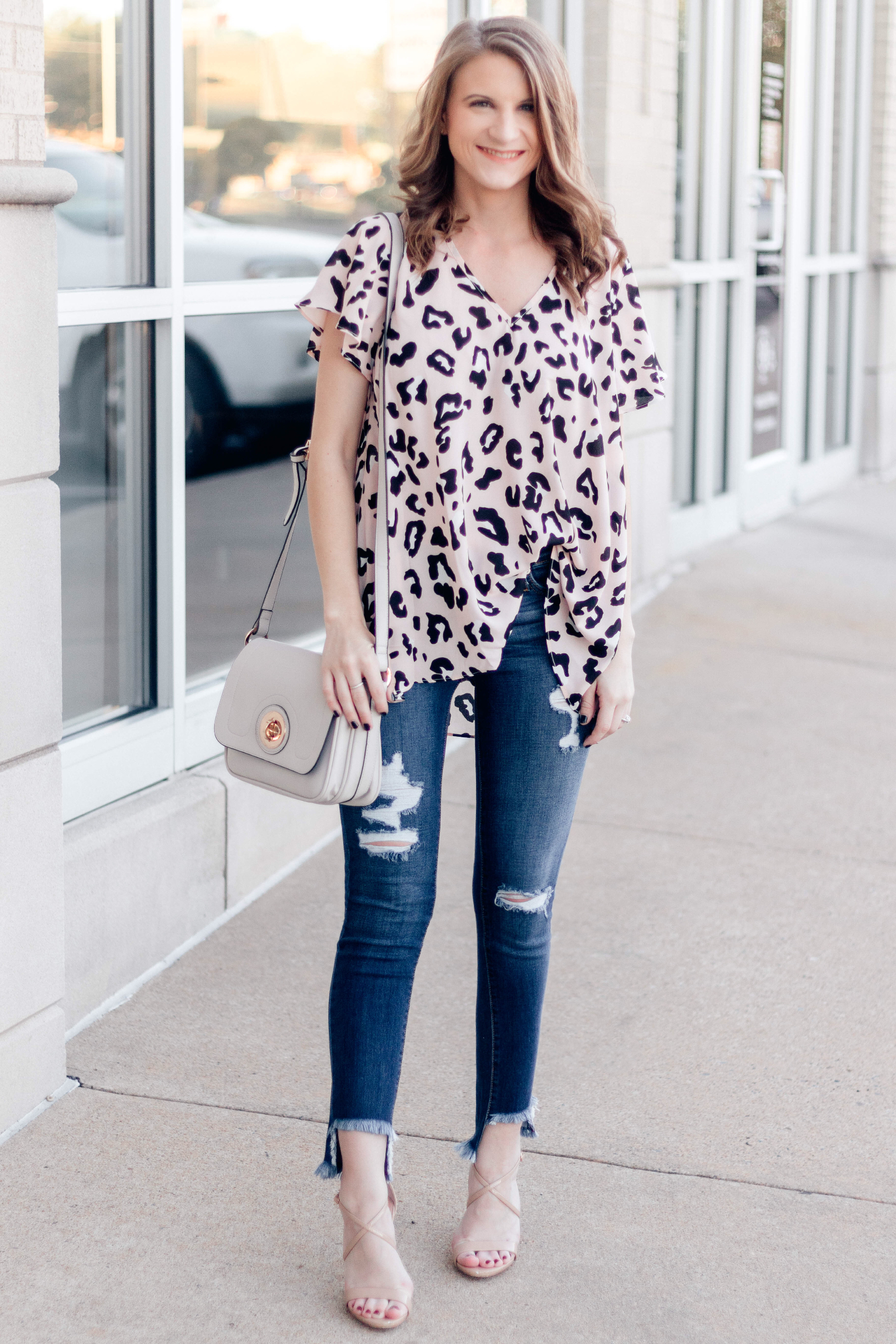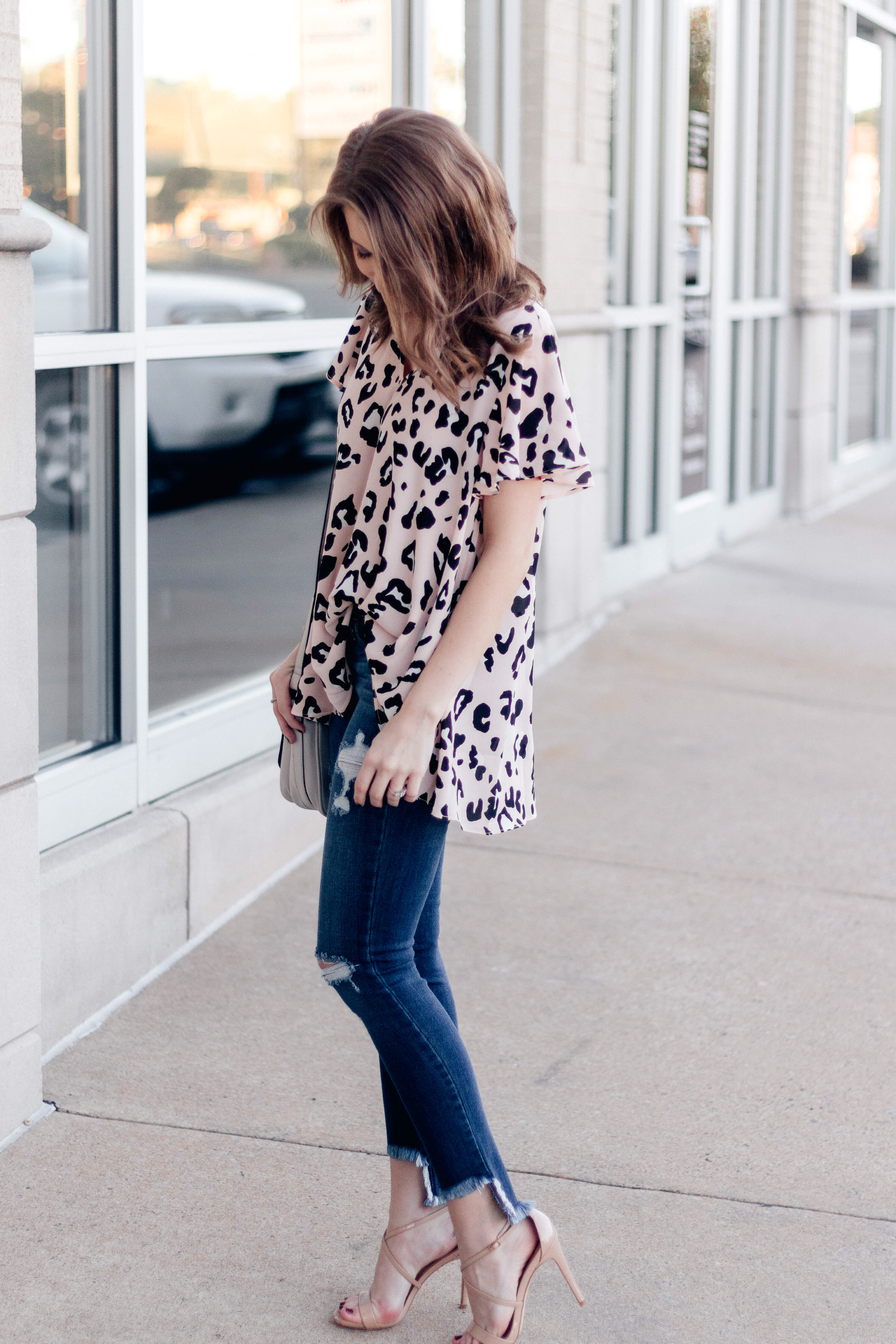 This outfit is one of my favorites! The flowing pink animal print top tucks nicely into distressed jeans with uneven, unfinished hems. I dressed up the outfit with my own pair of minimalist nude heels