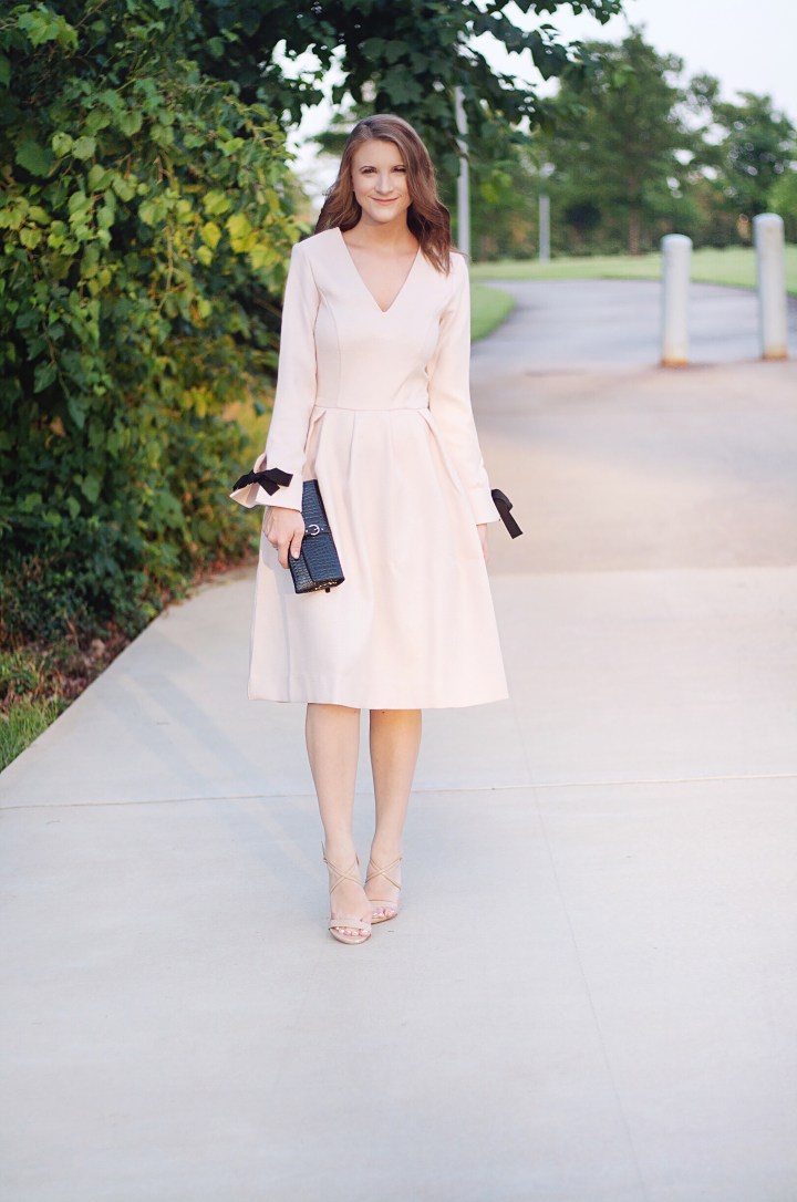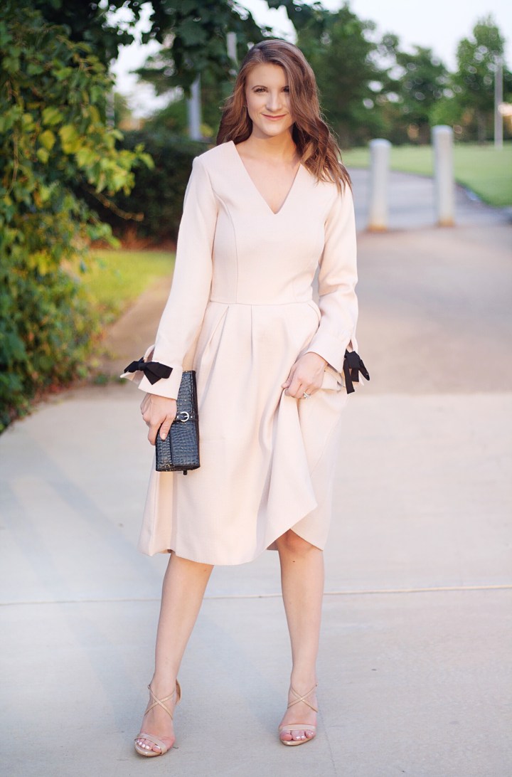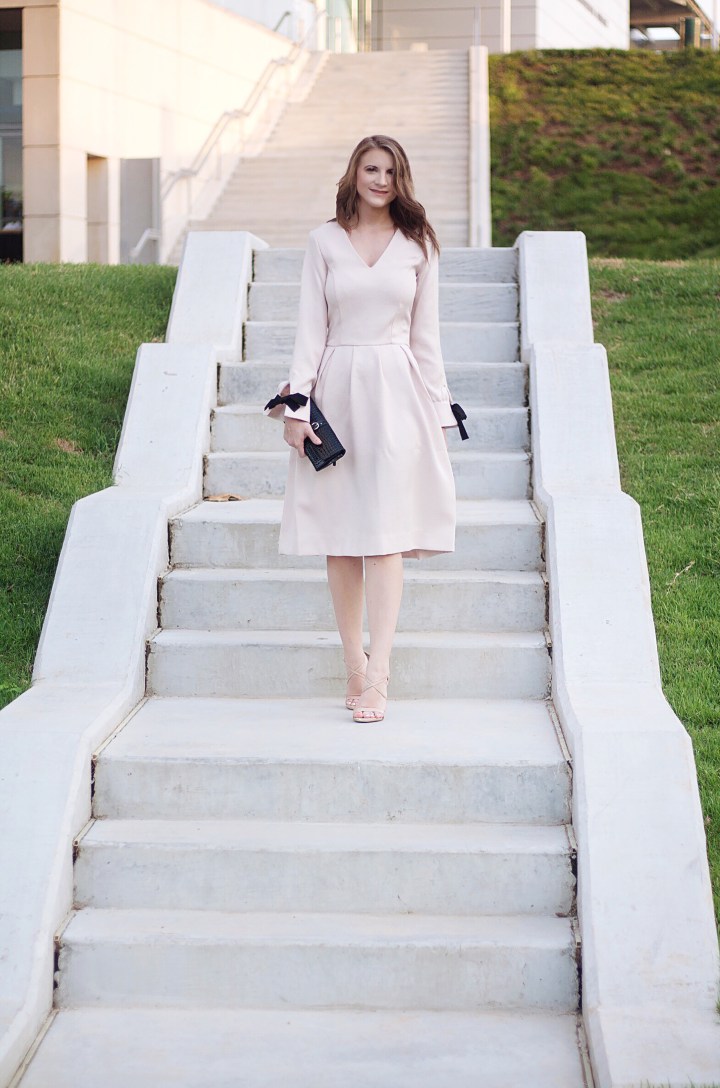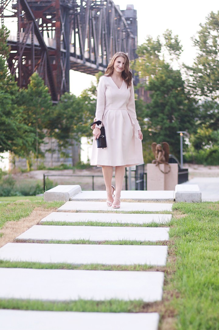 I don’t normally wear dresses with hemlines that hit below my knees. I’m petite (coming in at 5’2) so longer hemlines tend to make me look shorter. To combat this, I paired the dress with a simple pair of nude sandals to elongate my legs. (For a winter/holiday party look, I’m going to try to pair the Gigi dress with a pair of black Alexander McQueen heels. So stay tuned!)
