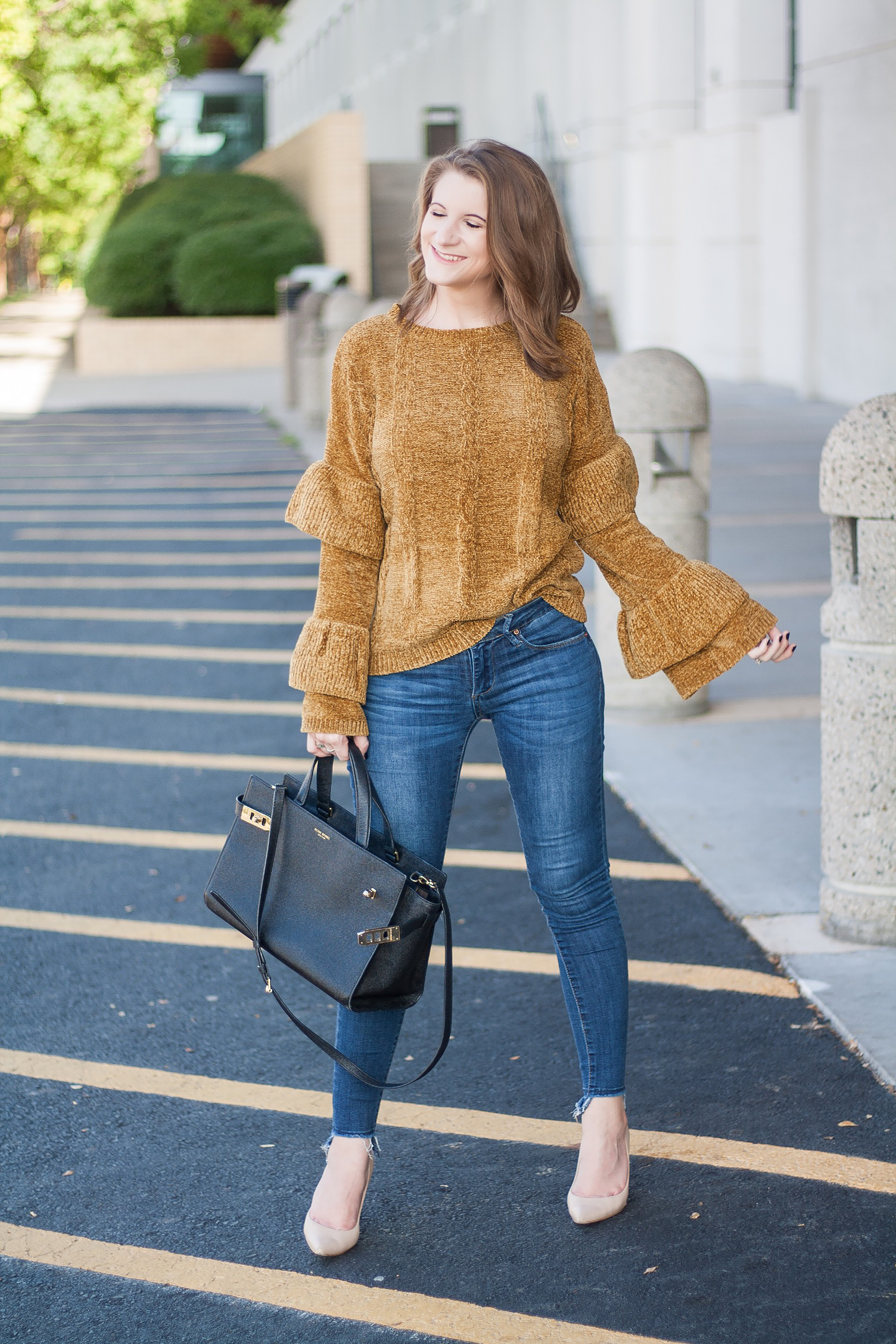 I wanted to keep the rest of this outfit simple so the sleeves of the sweater would take all of the attention, so I decided to pair this sweater with my favorite distressed skinny jeans. I threw on a pair of nude pumps, grabbed my favorite black handbag, and added a few subtle, silver jewelry pieces to finish off the look.